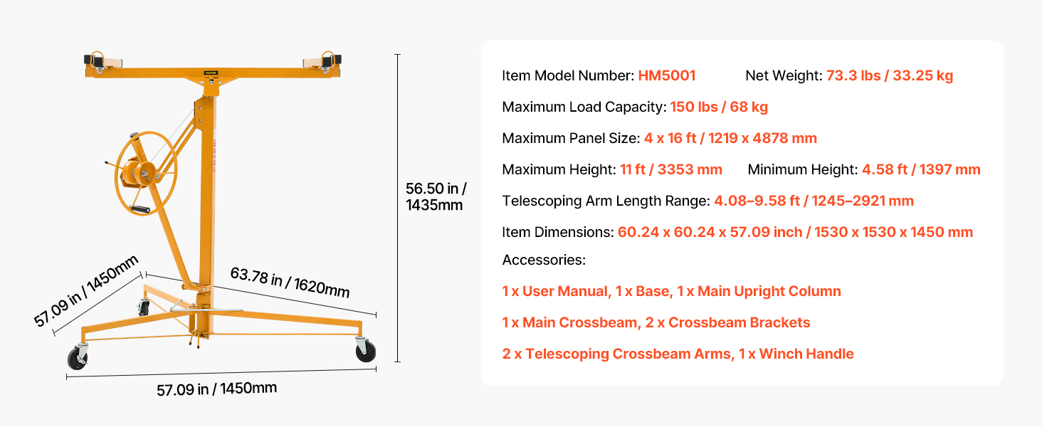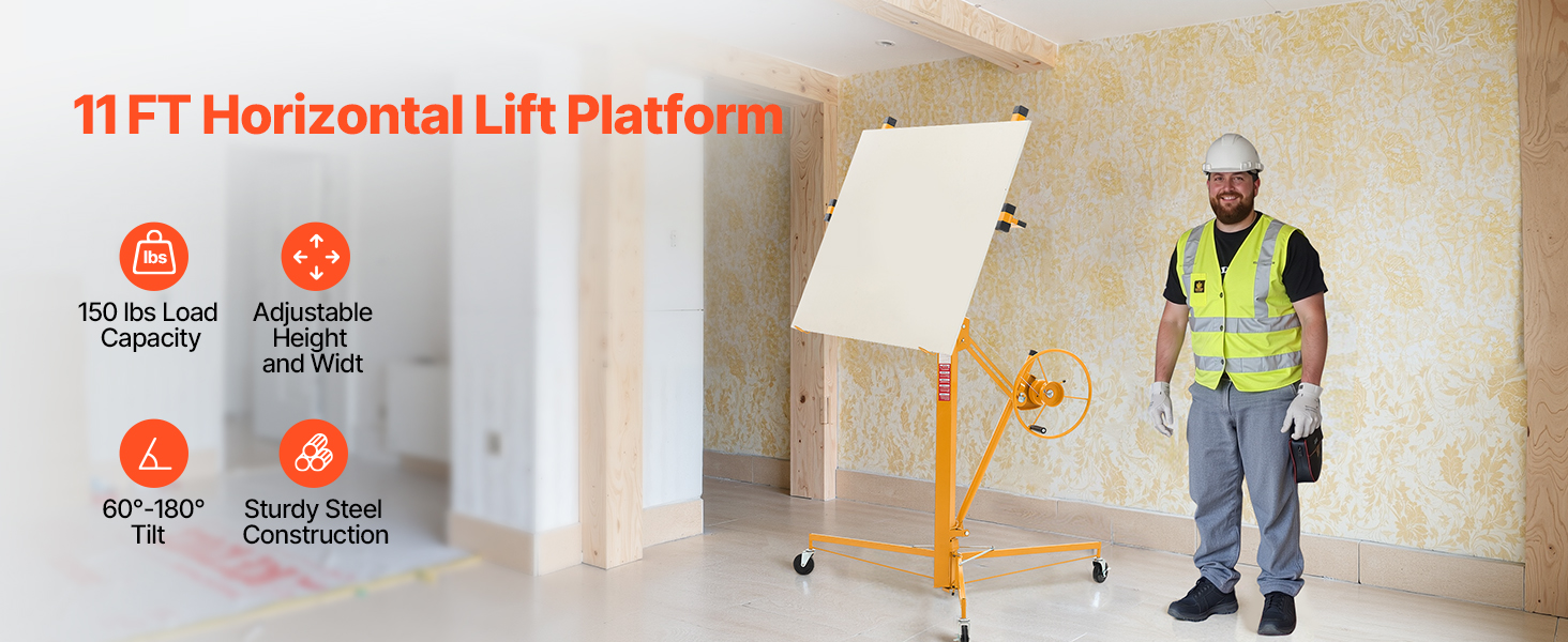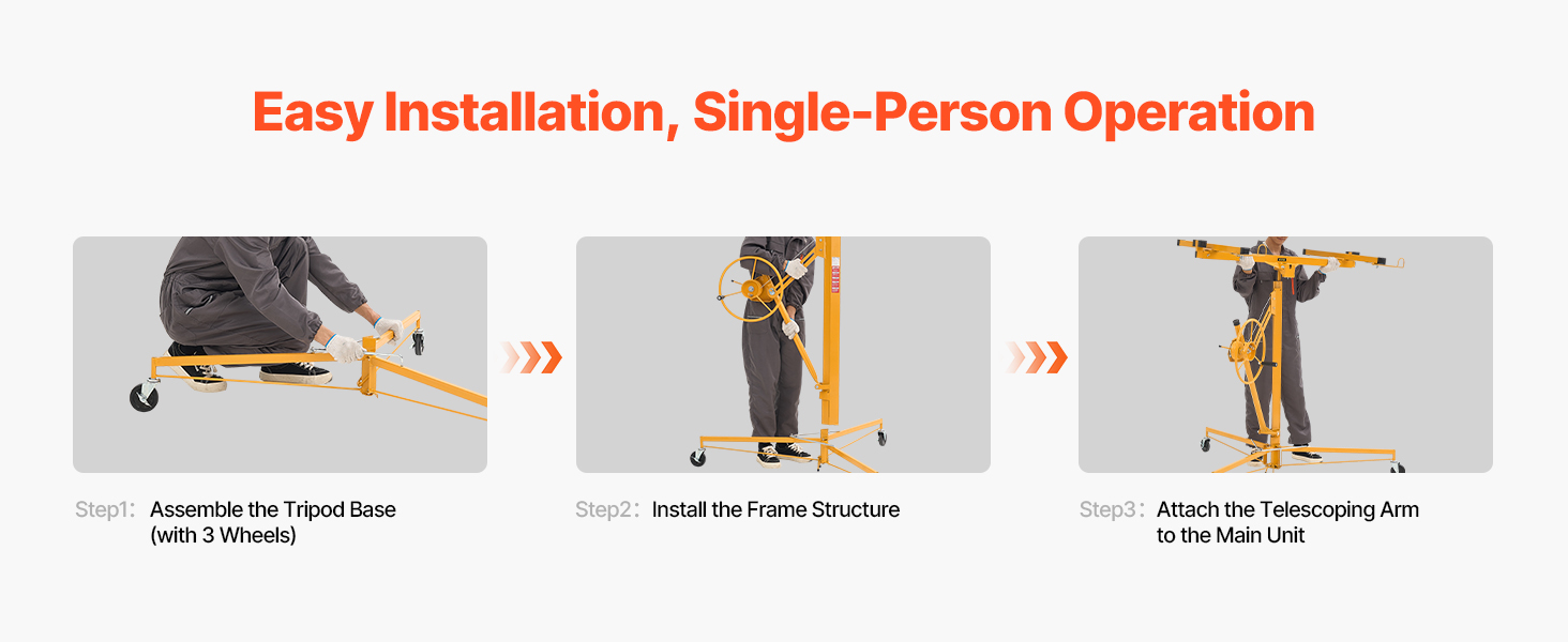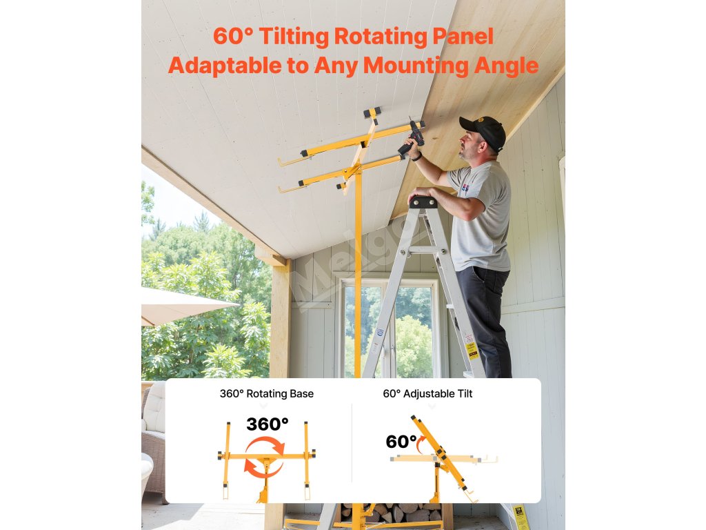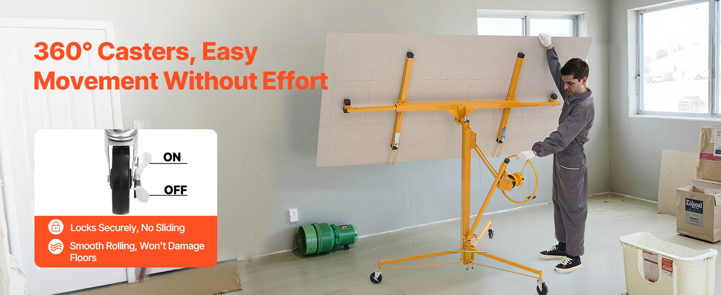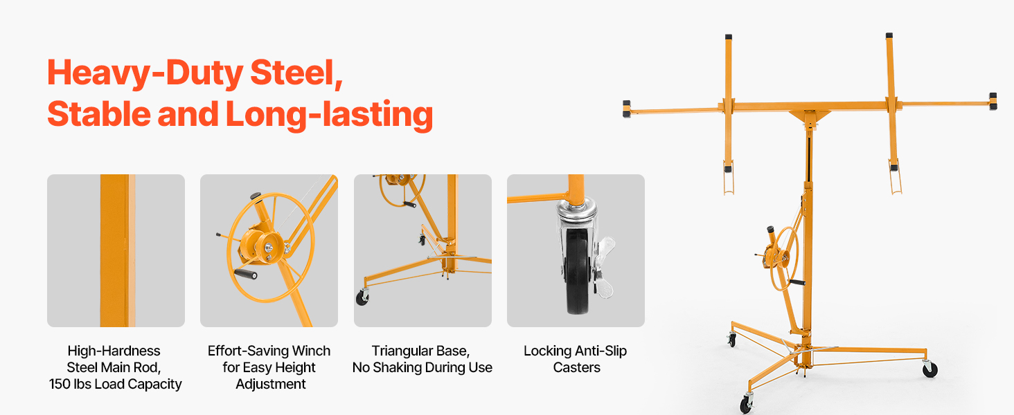Montáž alebo demontáž v priebehu niekoľkých sekúnd bez použitia náradia. Unesie až 150 libier. Vybavený kolieskami a brzdami pre vynikajúcu stabilitu a plynulú mobilitu, vďaka čomu je ideálny na jednoduchú inštaláciu sadrokartónu na strop a stenu.