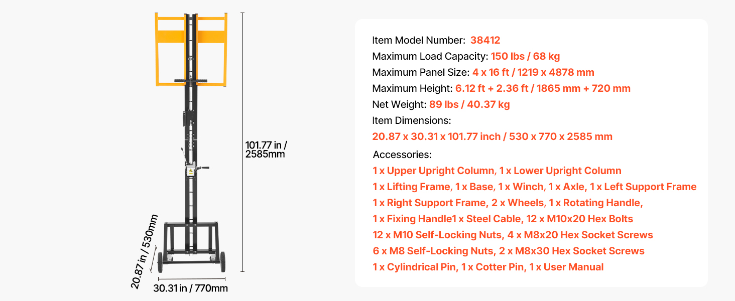 Zdvihák na sadrokartón 68 kg, max panel 1219×4878 mm, s kolieskami