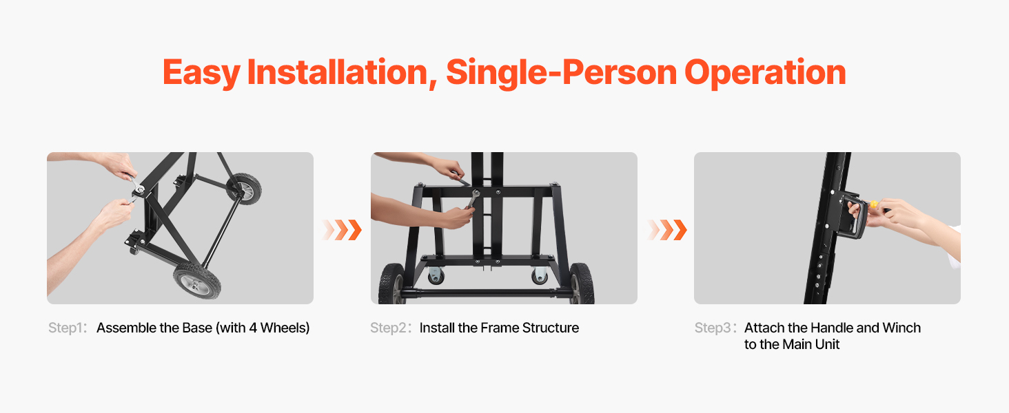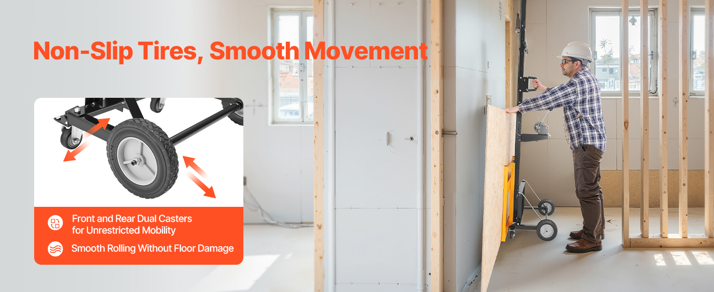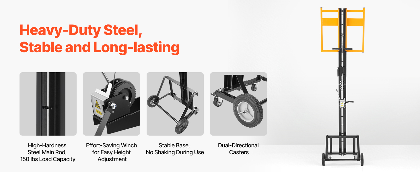 Montáž alebo demontáž v priebehu niekoľkých sekúnd bez použitia náradia. Unesie až 150 libier. Vybavený kolieskami a brzdami pre vynikajúcu stabilitu a plynulú mobilitu, vďaka čomu je ideálny na jednoduchú inštaláciu sadrokartónu na strop a stenu.