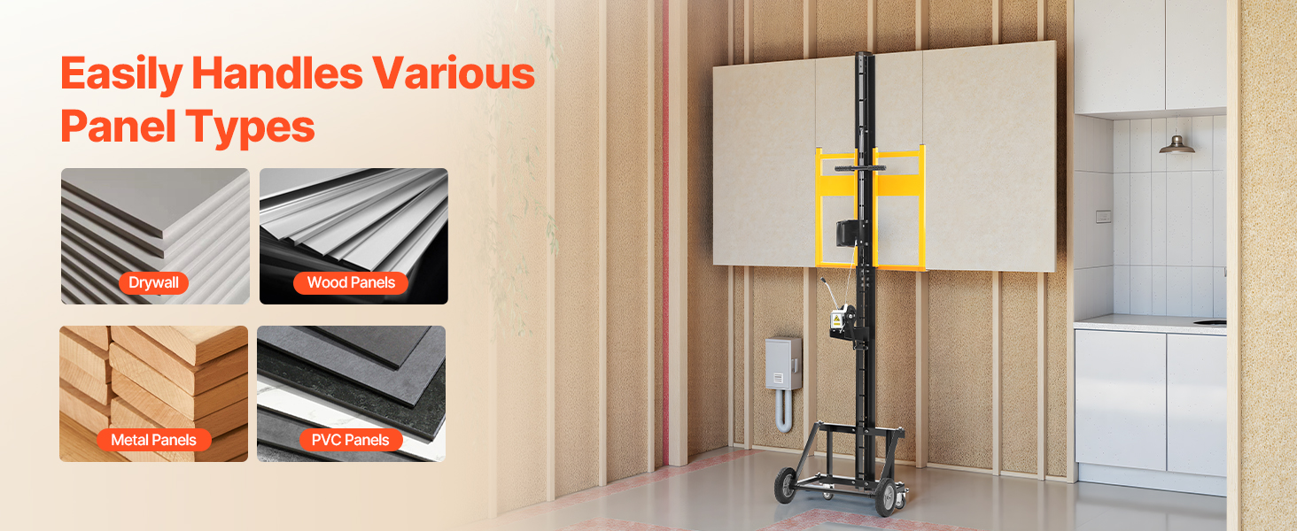 Tento zdvihák ľahko manipuluje s rôznymi materiálmi vrátane sadrokartónových dosiek, drevených panelov, plechov, PVC dosiek a ďalších, čím spĺňa vaše rozmanité potreby pri renovácii.