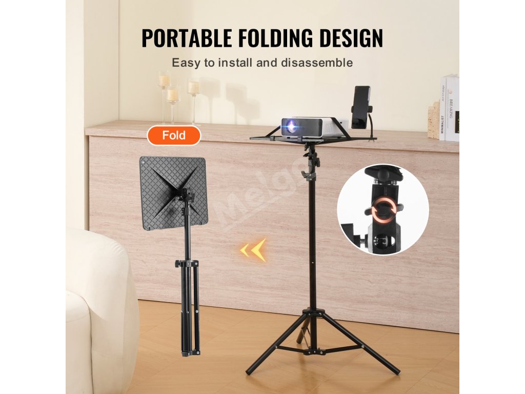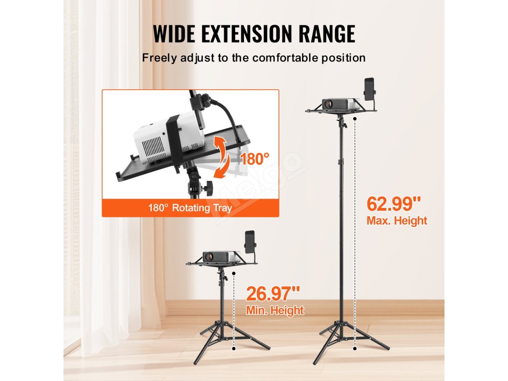 Vďaka širokému rozsahu výšky od 26,97 do 62,99 palca sa tento prenosný stojan na projektor prispôsobí používateľom rôznej výšky.