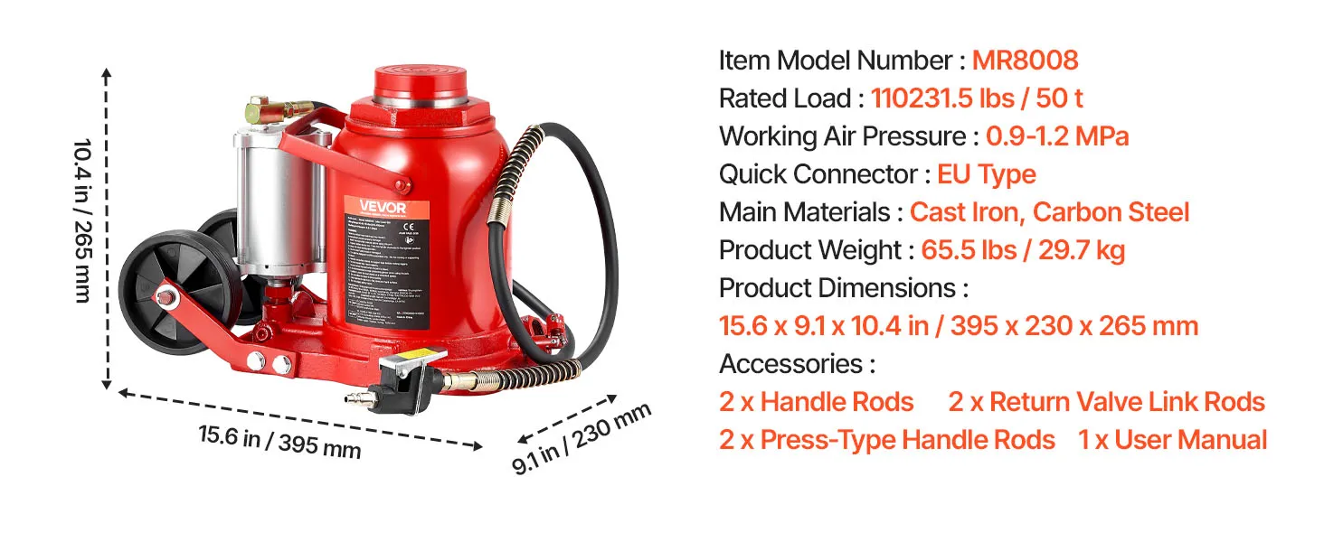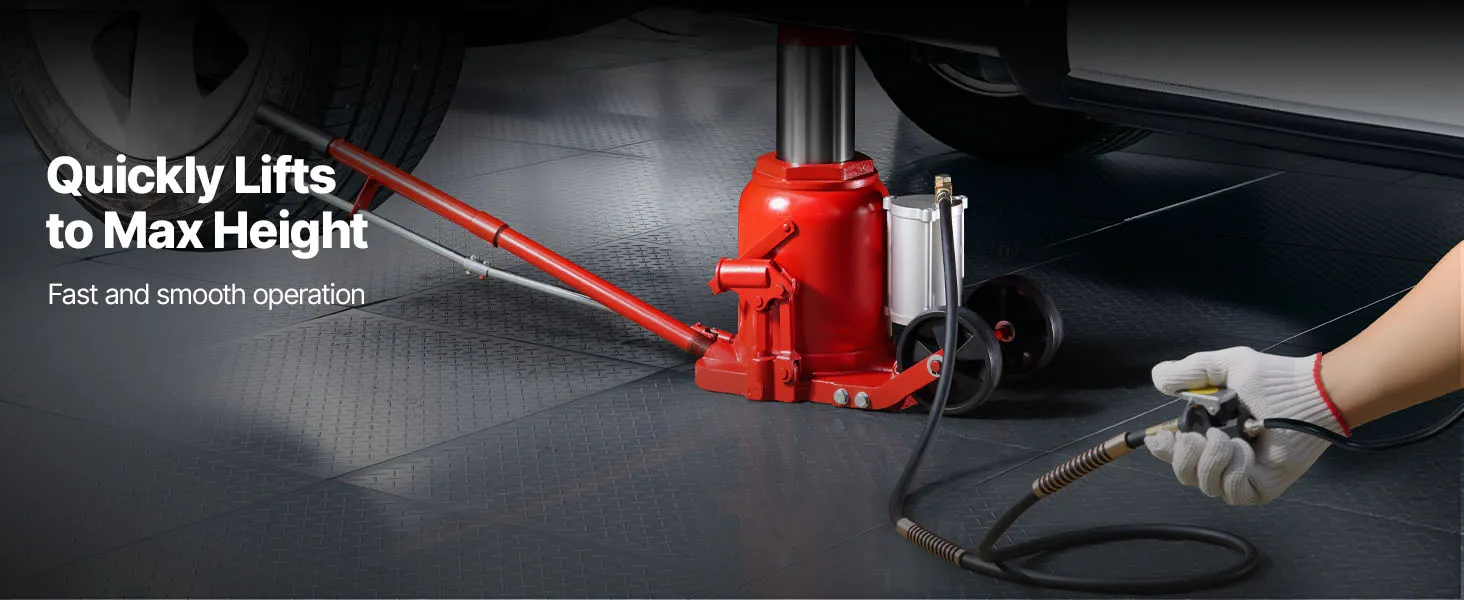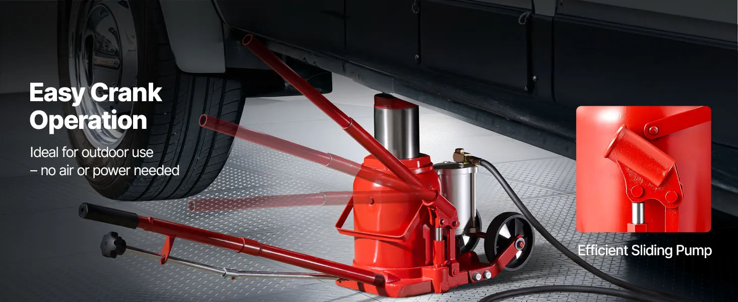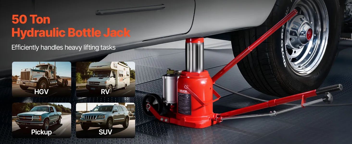 Tento ručný a pneumatický hydraulický zdvihák na fľaše využíva hydraulickú silu na stabilné zdvíhanie až do 50 ton. Zvládne ťažké úlohy, ako sú opravy vozidiel alebo domáca údržba na skrinkových nákladných vozidlách, obytných vozidlách, pick-upoch a SUV.