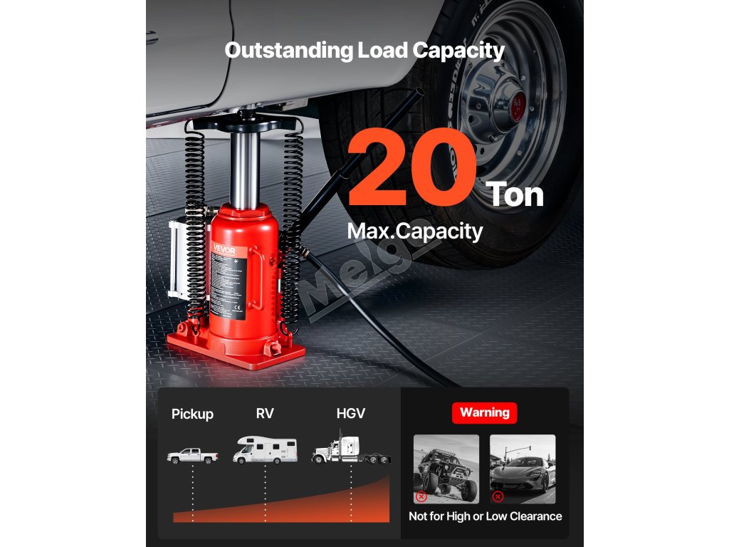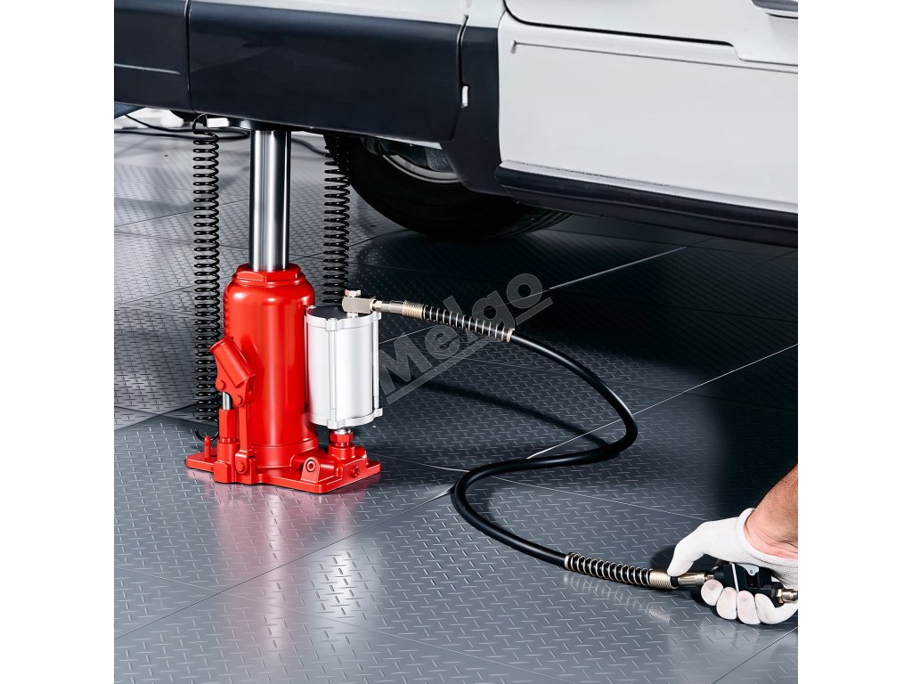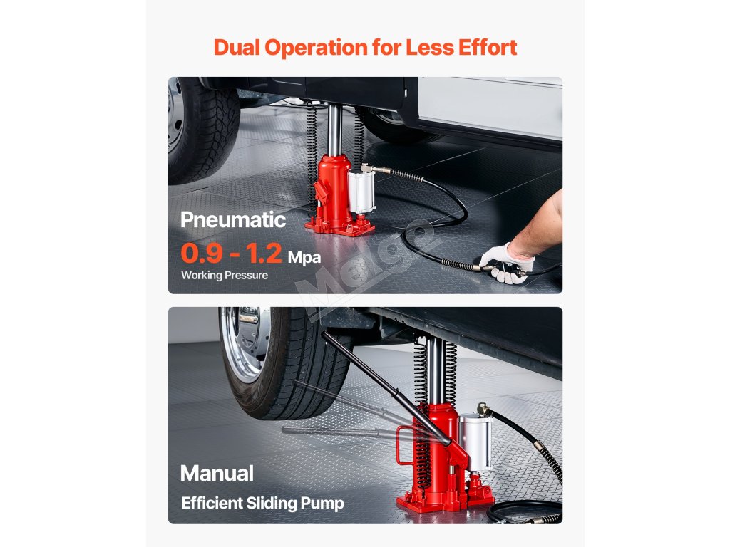 Tento ručný a pneumatický hydraulický zdvihák na fľaše využíva hydraulickú silu na stabilné zdvíhanie až 20 ton. Zvládne ťažké úlohy, ako sú opravy vozidiel alebo domáca údržba na skrinkových nákladných vozidlách, obytných vozidlách, pick-upoch a SUV.