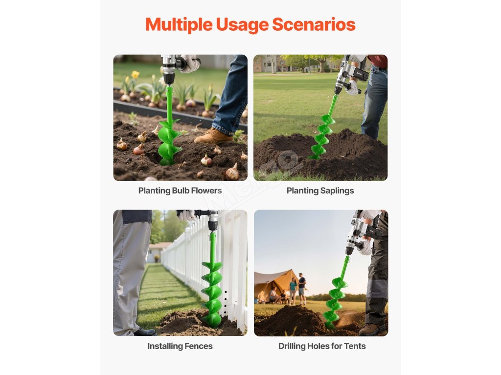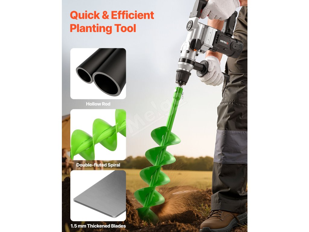 Náš vrták bez námahy vŕta do mäkkej pôdy, čím urýchľuje a uľahčuje výsadbu cibuľovín, kvetov a zeleniny. Ideálny pre záhradných nadšencov, ktorí chcú ušetriť čas a námahu. Tento šnekový vrták je ideálny aj na vŕtanie otvorov na inštaláciu plotov, stanov alebo vonkajších dekorácií.