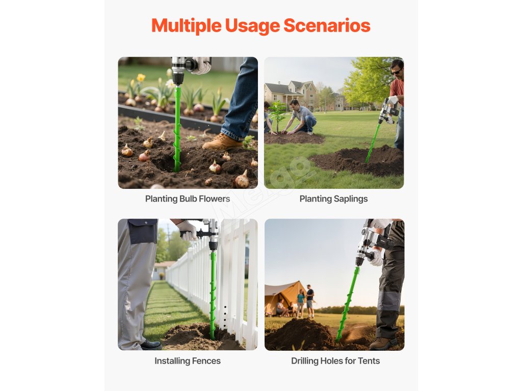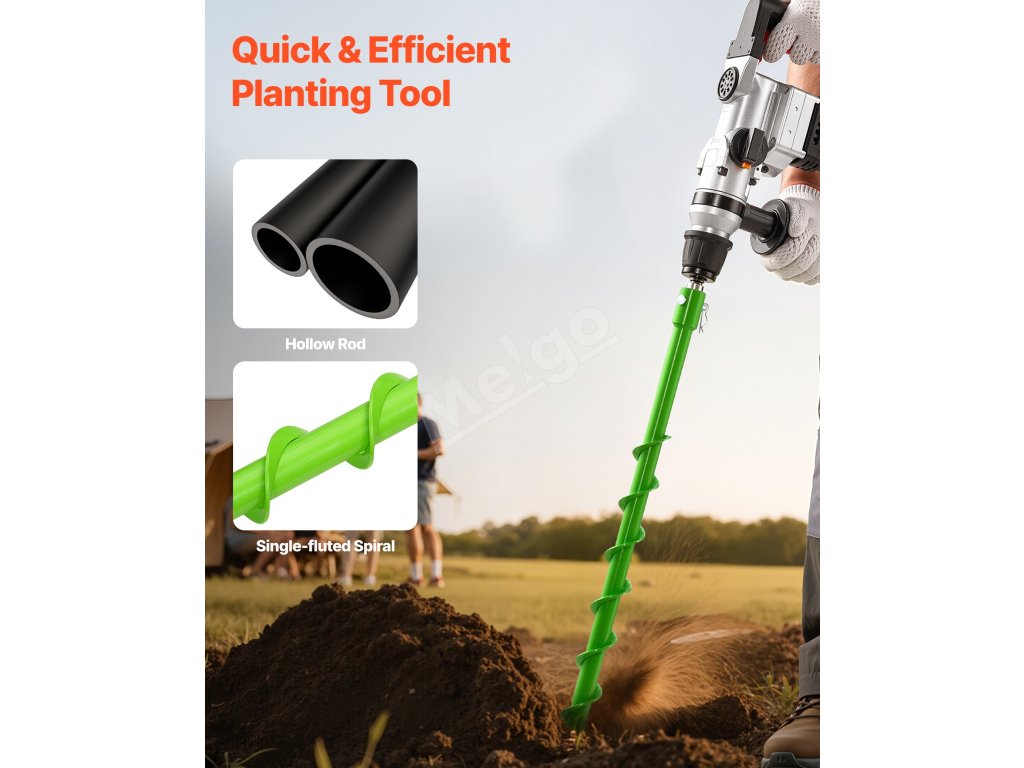 Náš vrták bez námahy vŕta do mäkkej pôdy, čím urýchľuje a uľahčuje výsadbu cibuľovín, kvetov a zeleniny. Ideálny pre záhradných nadšencov, ktorí chcú ušetriť čas a námahu. Tento šnekový vrták je ideálny aj na vŕtanie otvorov na inštaláciu plotov, stanov alebo vonkajších dekorácií.