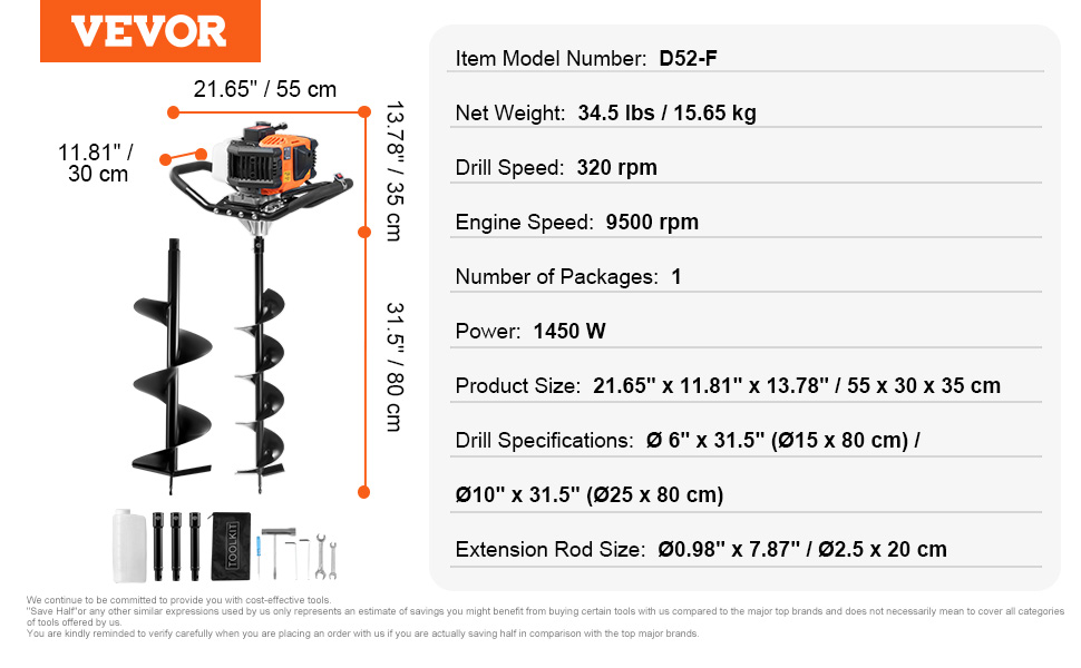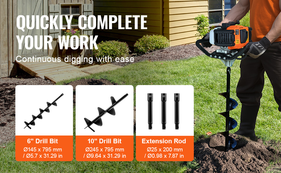 Benzínový zemný vrták 52cc 1450W, 6″ a 10″ vrtáky, 3 predĺženia