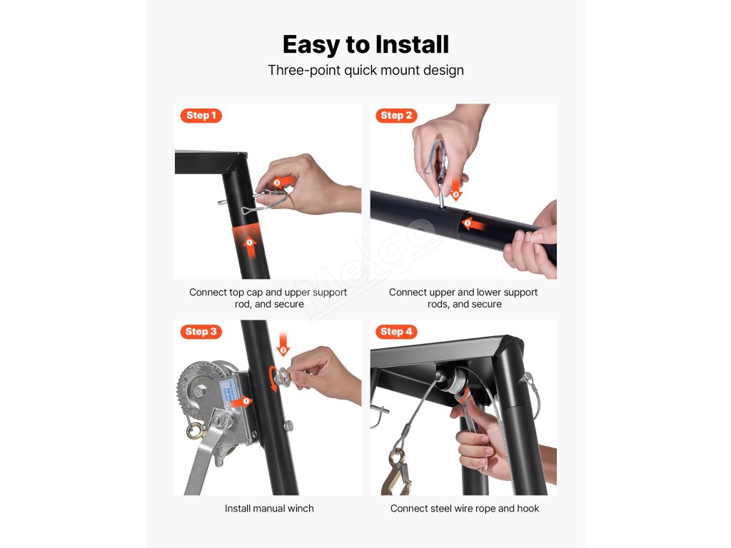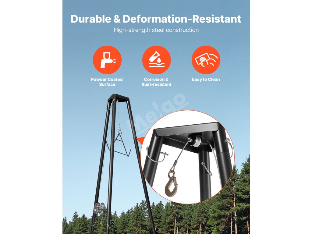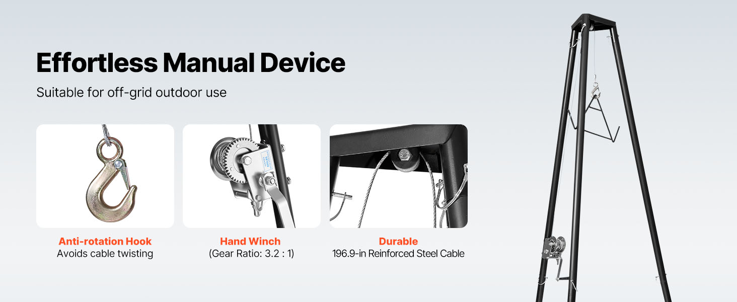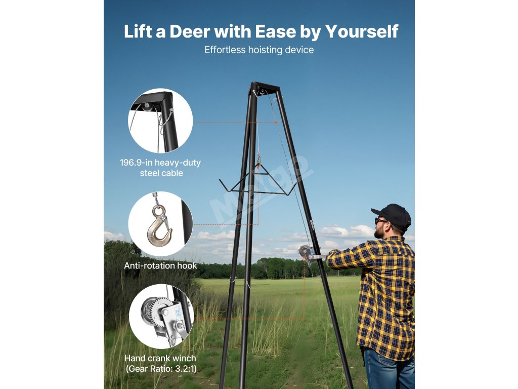 Náš kladkostroj na jeleniu zver poháňaný vysokokapacitným ručným navijakom umožňuje ľahko zdvihnúť až 500 kg, takže je ideálny na zdvíhanie zveri alebo ťažkých predmetov vo vonkajšom prostredí.