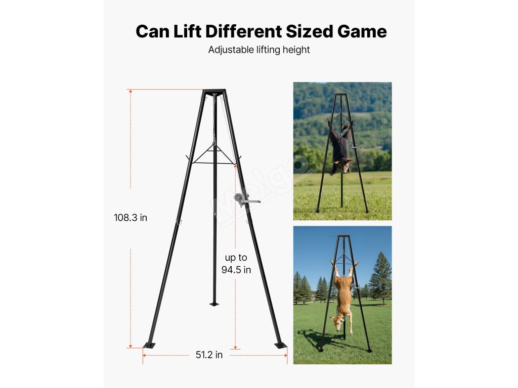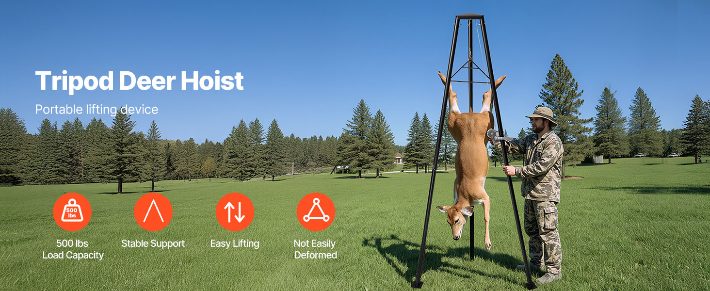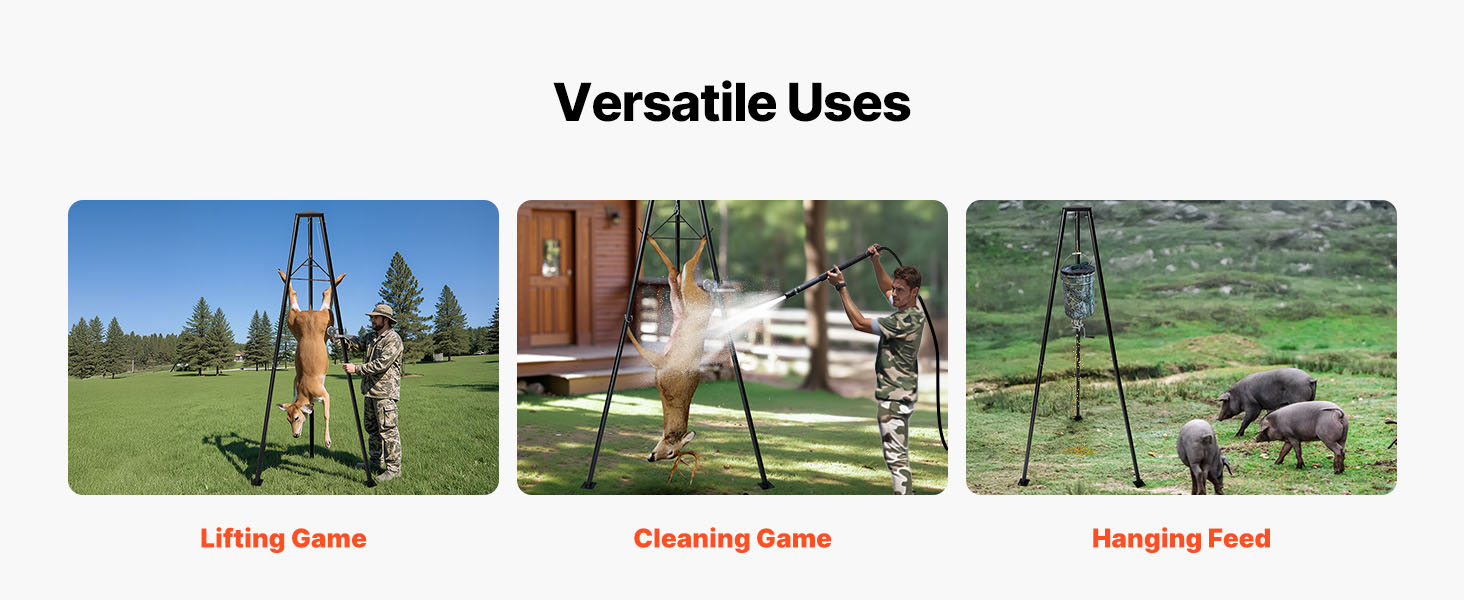 Záves na jeleňa je ideálny na lov, pomáha pri zdvíhaní, čistení a sťahovaní kože zveri. Je vhodný aj na použitie na farmách na zavesenie krmiva a iné ťažké zdvíhacie úlohy.