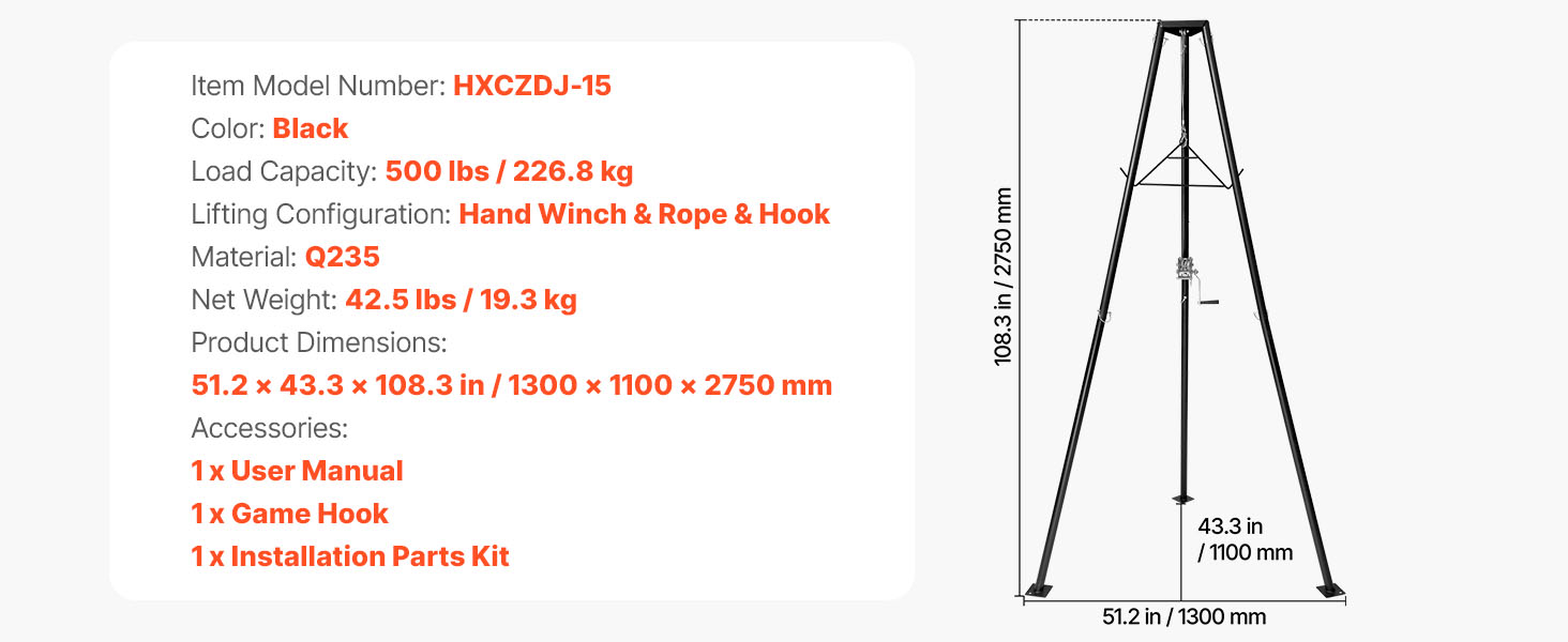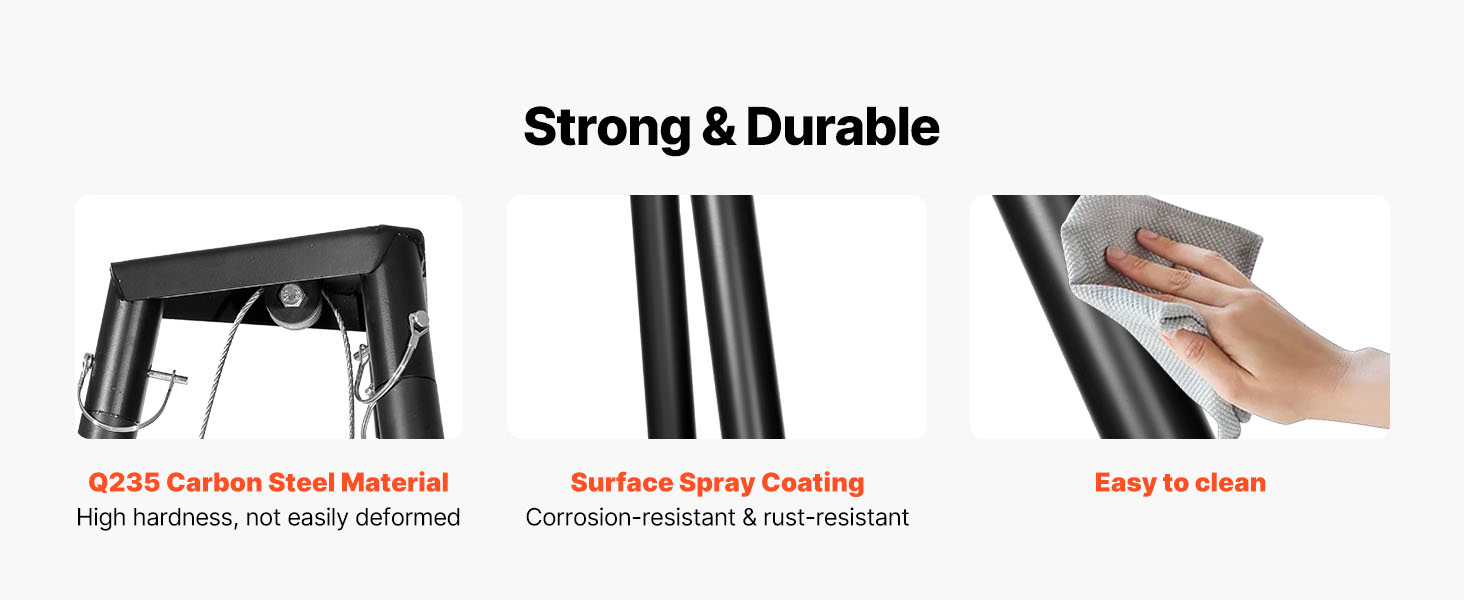 Tento kladkostroj na lov zveri je vyrobený z vysokopevnostnej uhlíkovej ocele Q235, je vysoko odolný a pri veľkom zaťažení sa neohýba ani nedeformuje. Striekaný povrch odoláva korózii a hrdzi a po použití sa ľahko čistí.