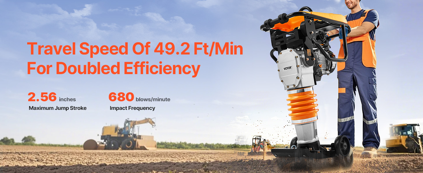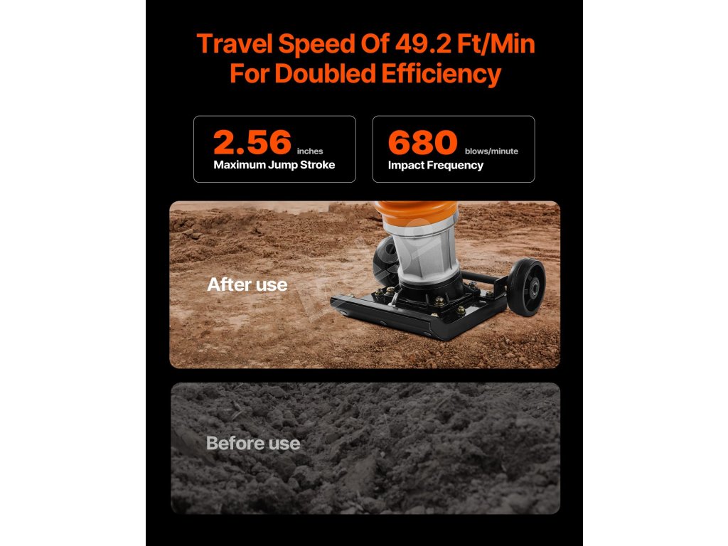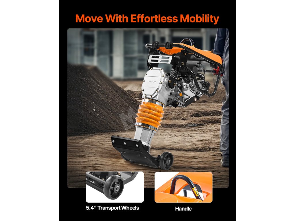 Kompaktor so skákacím zdvihákom je vybavený motorom s výkonom 6,5 HP, ktorý poskytuje viac ako 3500 libier nárazovej sily a hĺbku zhutnenia 26 palcov. Jeho rukoväť tlmiaca nárazy a transportné kolieska umožňujú pohodlnú obsluhu, čím zvyšujú kvalitu projektu a produktivitu v rôznych stavebných podmienkach.