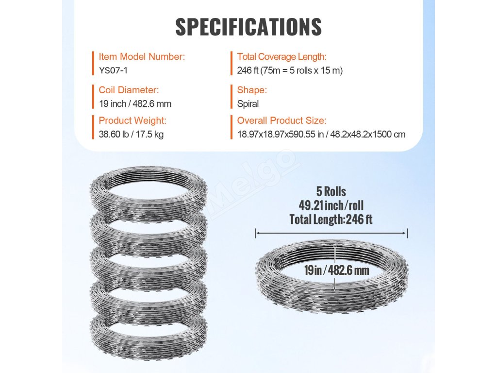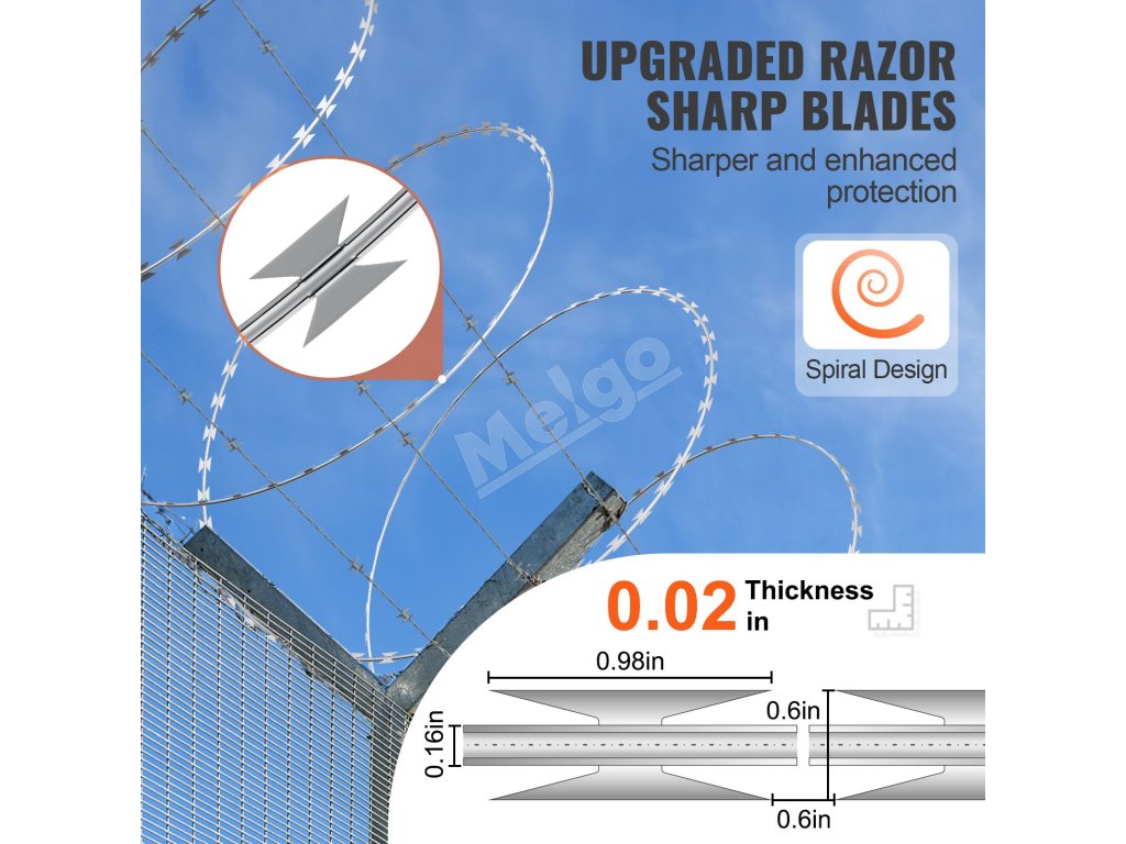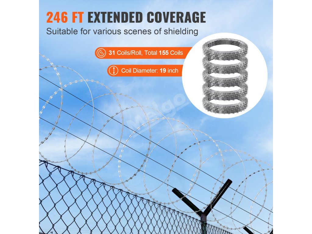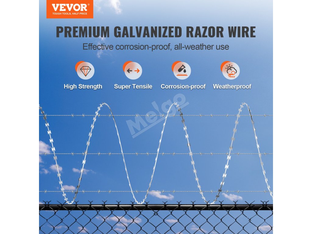 Náš žiletkový drôt je vybavený vysokopevnostným žiarovým zinkovaním, ktoré zaručuje odolnosť proti korózii. S rozsiahlym pokrytím 246 stôp, 0,02" ostrými čepeľami a 0,16" hrubým jadrom drôtov poskytuje vynikajúcu ochranu pred špirálou. Navyše sa dodáva s ochrannými rukavicami na inštaláciu bez zranení.