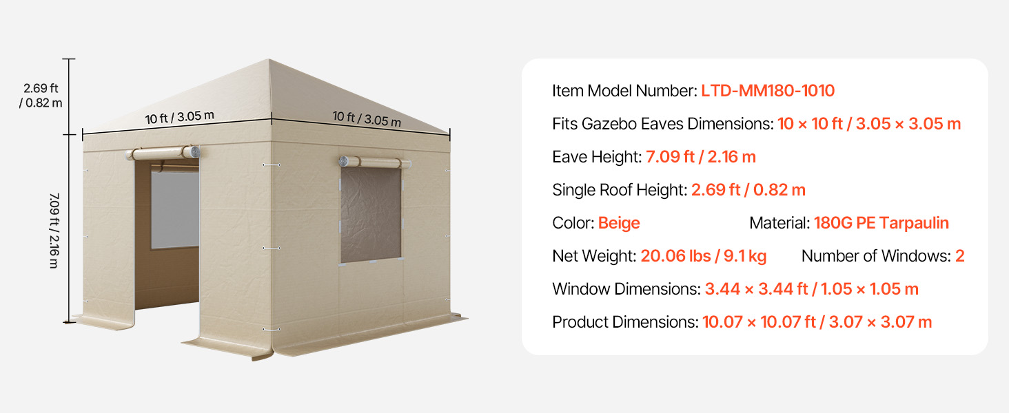 | Vhodné pre altánok Rozmery okapu | 10 × 10 ft / 3,05 × 3,05 m |