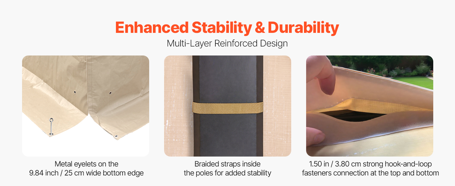 Tento univerzálny zimný kryt pre altánky má 9,84 palca / 25 cm zemný lem s kovovými očkami na upevnenie základne. Zosilnené upevňovacie popruhy obopínajú stĺpiky, zatiaľ čo 1,5 palca / 3,8 cm ťažké suché zipsy spájajú panely pre extra odolnosť voči vetru a stabilitu.
