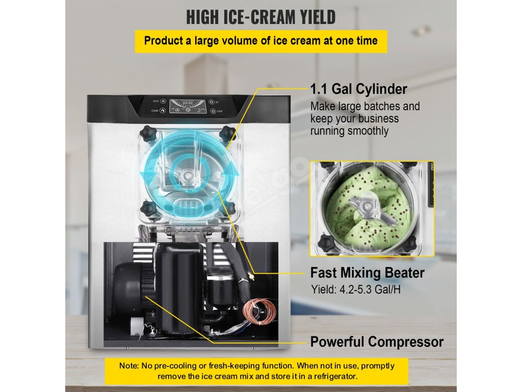Vďaka zabudovanému chladiacemu valcu s objemom 1,1 galóna a rýchlo rotujúcemu trojitému šľahaču sa náš komerčný stroj na výrobu tvrdej zmrzliny vyznačuje efektívnou výrobou zmrzliny a hodinový výkon dosahuje približne 4,2 - 5,3 galóna. Perfektne našľahá hladké, krémové výsledky.