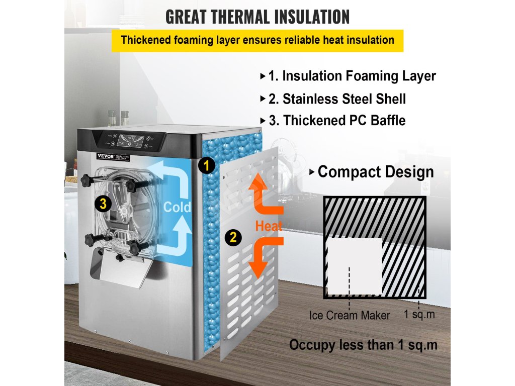 Vysokoúčinný systém výroby zmrzliny, ktorý sa skladá z vysokorýchlostného rotujúceho šľahača a chladiaceho systému. Šľahač hladkej jemnej zmrzliny vytvára bohato hladké, krémové výsledky. Zabudovaný kondenzátor s medenou trubicou s veľkou plochou vzduchových otvorov rozmiestnených okolo uľahčuje rovnomerné chladenie a rozptyl tepla.