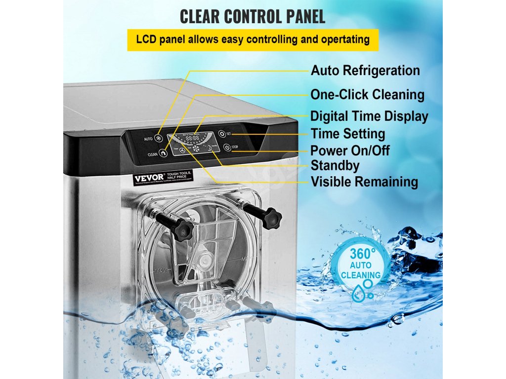 Funkčne bohatý ovládací panel v sklonenom dizajne je užívateľsky prívetivý na ovládanie, čím sa vyhnete problémom s ohýbaním. Náš zmrzlinovač na tvrdú zmrzlinu integruje viacero funkcií, ako je automatické chladenie, čistenie jedným kliknutím, nastavenie času atď. Pomocou obrazovky displeja môžete ľahko zistiť čas výroby a zostávajúce množstvo.