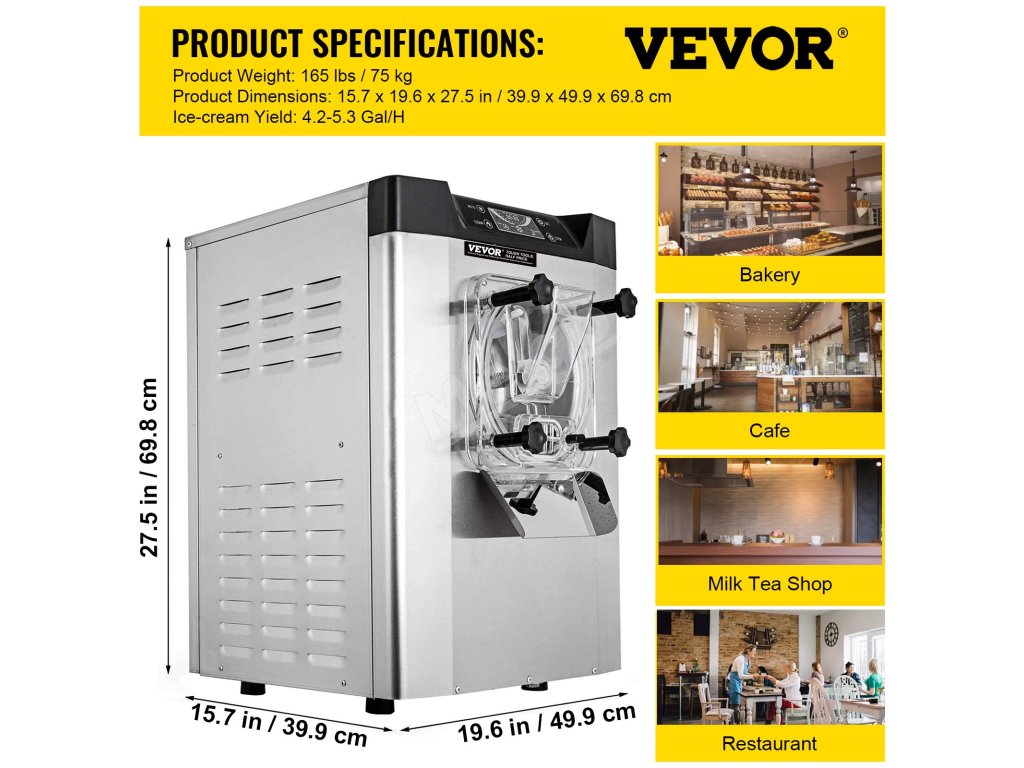 Náš komerčný stroj na tvrdú zmrzlinu, vyrobený z potravinárskej nehrdzavejúcej ocele a materiálu PC, sa jednoducho čistí a je konštruovaný tak, aby vydržal. Má veľký chladiaci valec s kapacitou 1,1 Gal (4,2 l), ktorý zabezpečuje vysokú produkciu 4,2-5,3 Gal (16-20 l) za hodinu. Tento profesionálny stroj na výrobu zmrzliny je ideálny nielen pre obchodné reťazce s chladenými nápojmi, bary alebo iné gastronomické prevádzky, ale aj pre vašu vlastnú rodinu. Bez triviálnych krokov možno v okamihu vyrobiť tvrdú zmrzlinu a vybrať si rôzne príchute podľa vlastnej chuti.
