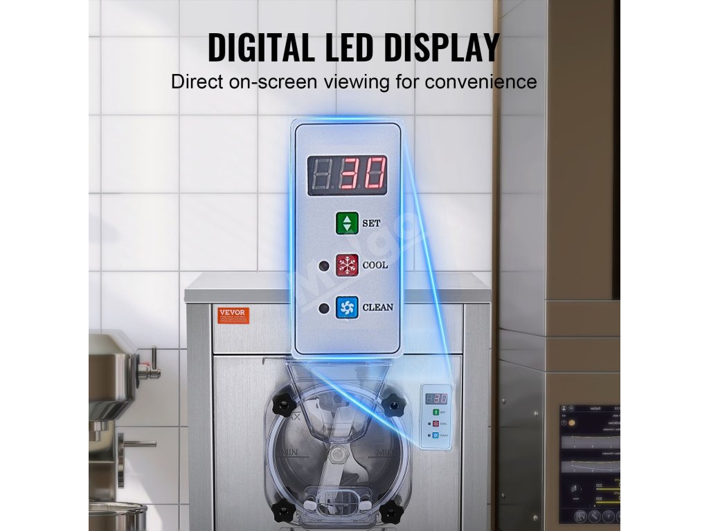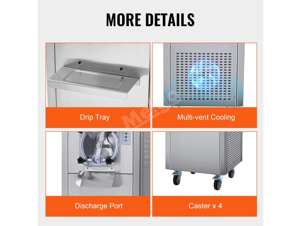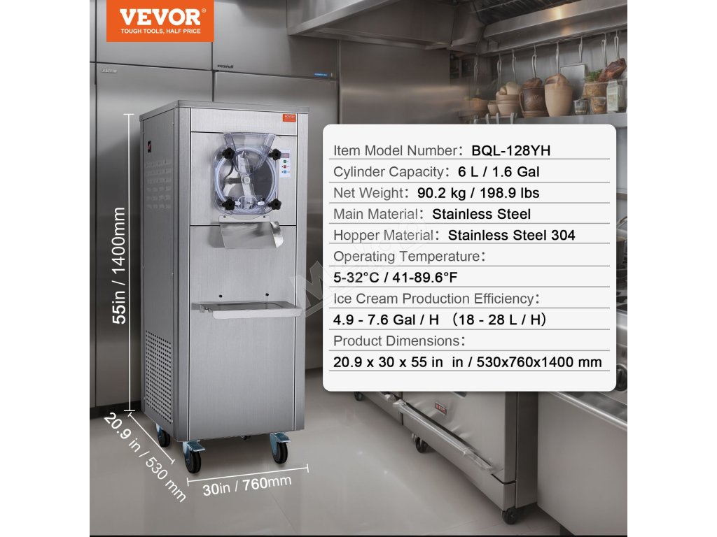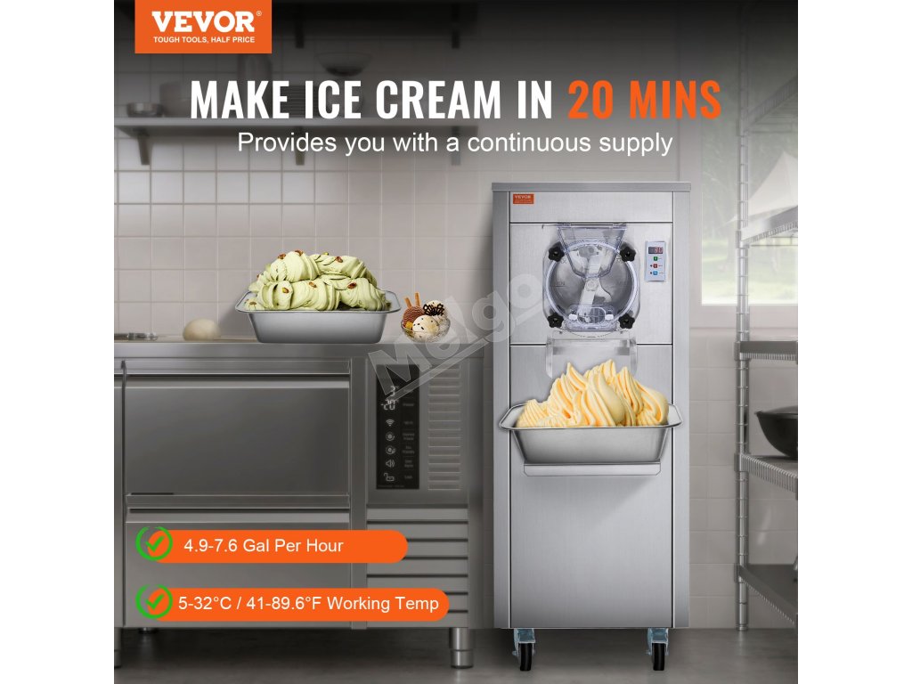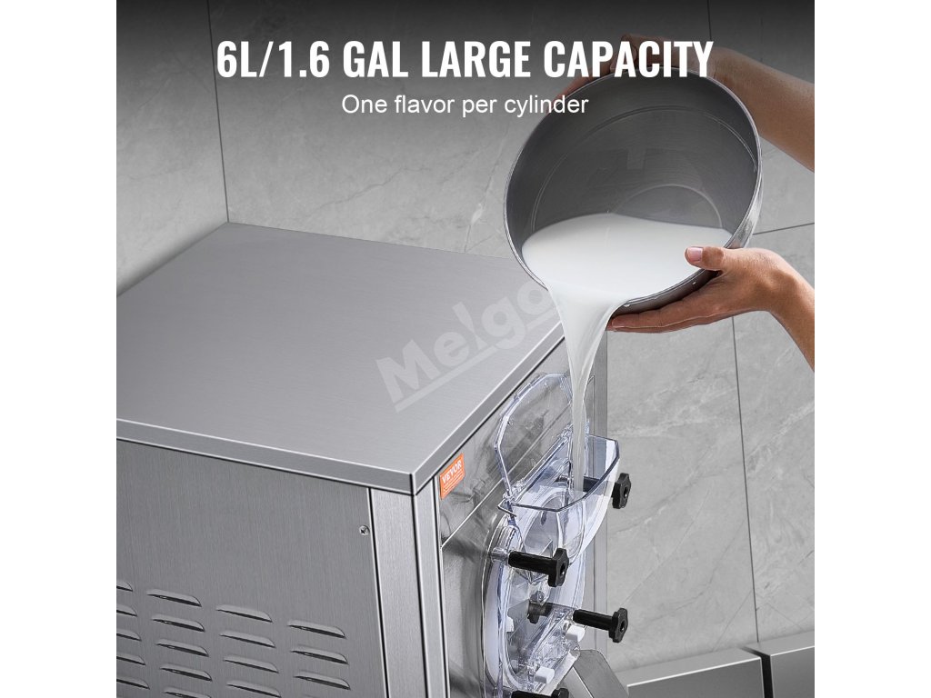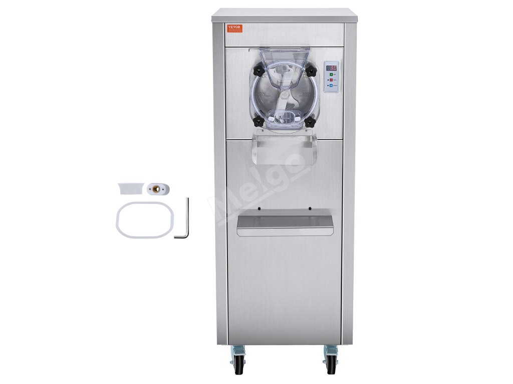 Tento komerčný stolový zmrzlinovač vyrobí zmrzlinu len za 20 minút. S výkonným kompresorom, ktorý pracuje ticho s hlučnosťou menej ako 66 dB. Kapacita 6 l/1,6 galónov dokáže vyrobiť 18 l/4,8 galónov za hodinu, čo je ideálne na miešanie hladkej tvrdej zmrzliny.