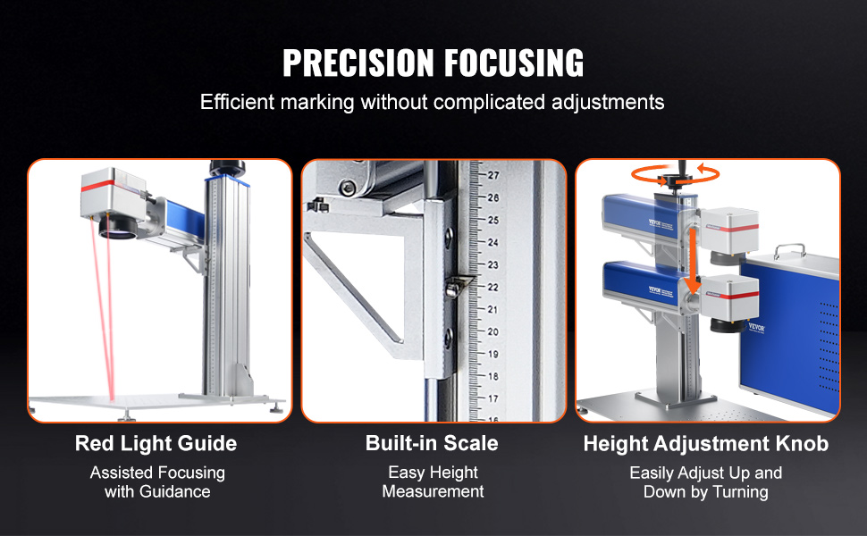 Otáčaním gombíka značkovacieho stroja môžete galvanometrický laser ľahko zamerať na označovaný predmet. Pri zaostrovaní pomáha červené svetlo a stupnica na nosnom stĺpiku uľahčuje meranie a zaznamenávanie výšky zaostrenia.