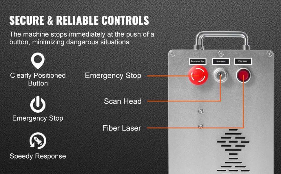 Tento vláknový laserový stroj je vybavený výrazným a ľahko použiteľným tlačidlom núdzového zastavenia. V prípade požiaru alebo inej mimoriadnej udalosti počas značenia sa stlačením tohto tlačidla stroj okamžite zastaví, čím sa zvýši bezpečnosť.