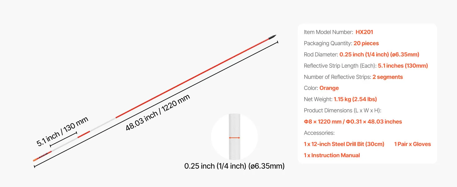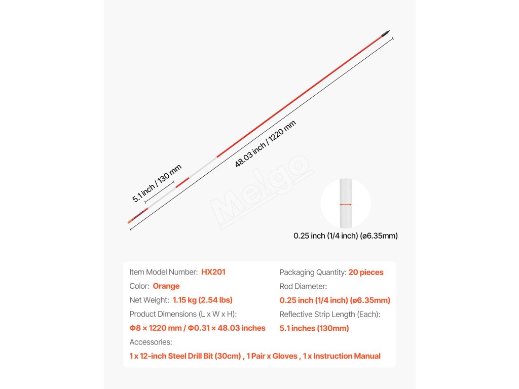 Označovacie tyče 20 ks 122cm Ø6.35mm reflexné s vrtákom 12 in