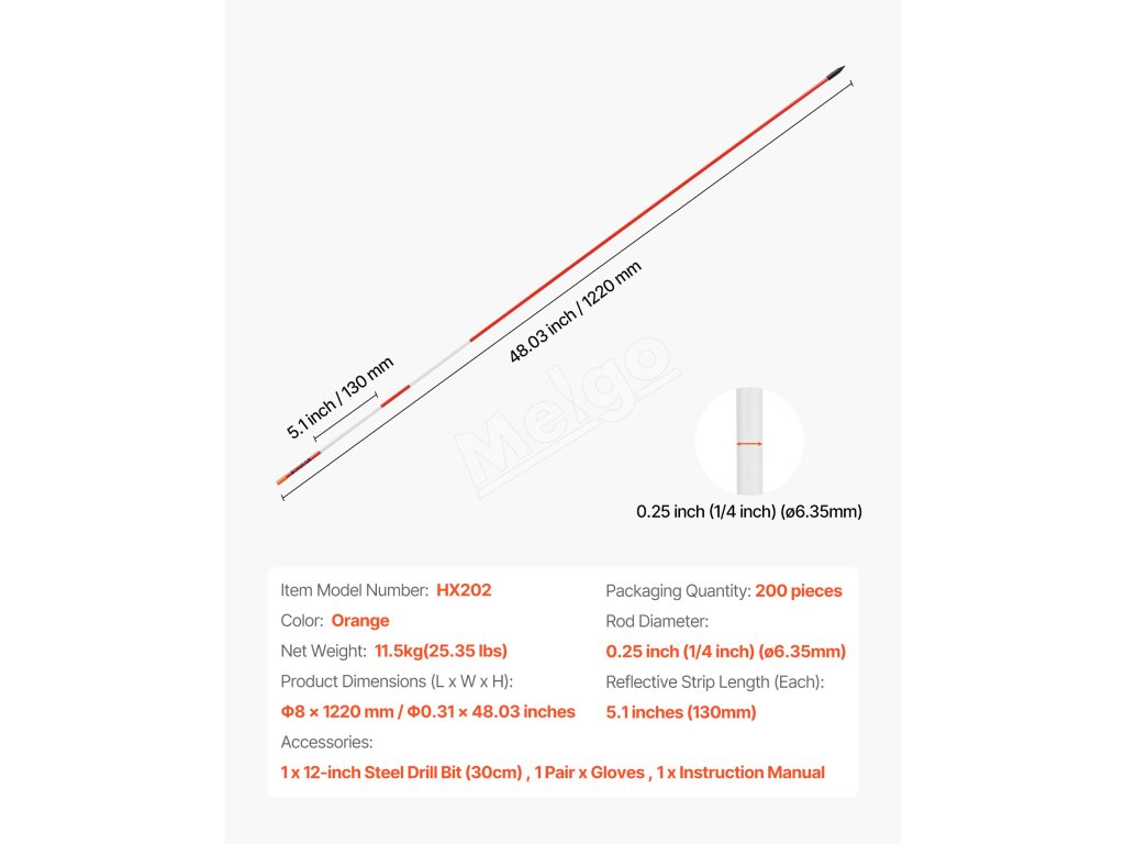 Reflexné tyče na príjazdové cesty 200 ks, 122cm, 6.35mm, 12 in vrtáky