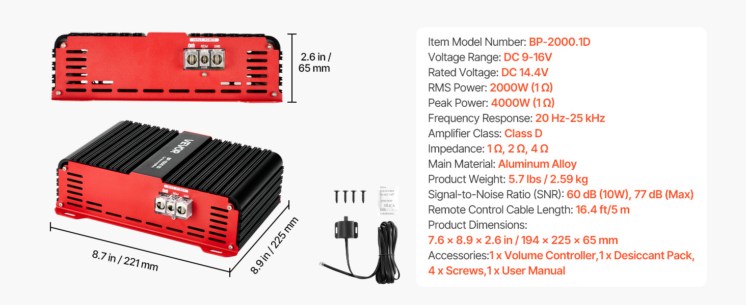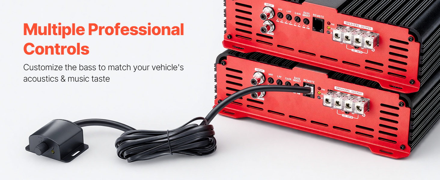 Diaľkový ovládač basov monoblokového zosilňovača sa dodáva so 16,4 ft káblom, ktorý umožňuje flexibilné umiestnenie. Upravujte hlasitosť basov v reálnom čase zo sedadla vodiča podľa podmienok na ceste alebo typu hudby bez zastavenia, čím presne prispôsobíte svoju hudbu a náladu.