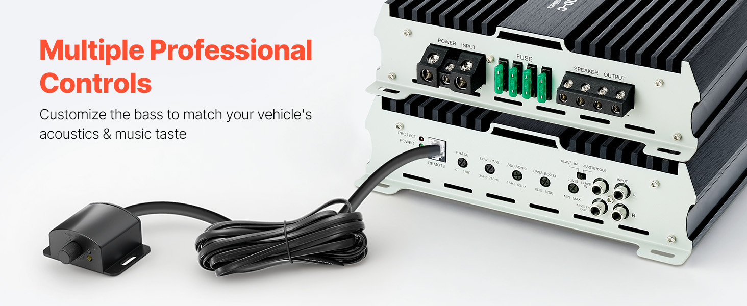 Diaľkový ovládač basov monoblokového zosilňovača sa dodáva s káblom s dĺžkou 16,4 ft, čo umožňuje flexibilné umiestnenie. Upravujte hlasitosť basov v reálnom čase zo sedadla vodiča podľa podmienok na ceste alebo typu hudby bez zastavenia, čím presne prispôsobíte svoju hudbu a náladu.