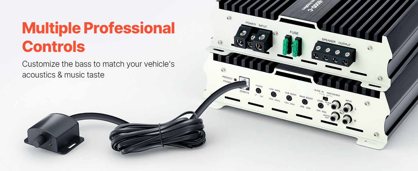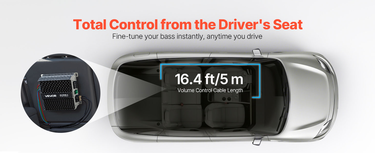 Diaľkový ovládač basov monoblokového zosilňovača sa dodáva s káblom s dĺžkou 16,4 ft, čo umožňuje flexibilné umiestnenie. Upravujte hlasitosť basov v reálnom čase zo sedadla vodiča podľa podmienok na ceste alebo typu hudby bez zastavenia, čím presne prispôsobíte svoju hudbu a náladu.