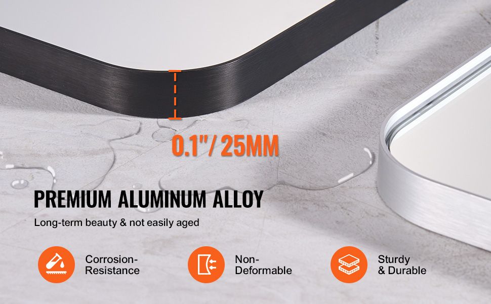 Ľahký rám zrkadla vyrobený z vysokokvalitnej hliníkovej zliatiny je odolný voči korózii a zachováva si lesk aj vo vlhkých priestoroch, ako sú kúpeľne, a ponúka dlhotrvajúcu odolnosť s elegantným a moderným vzhľadom.