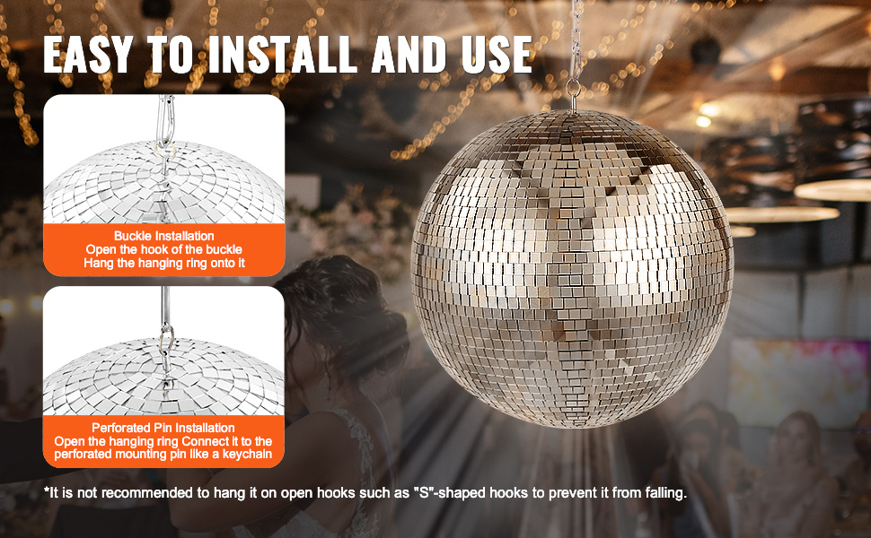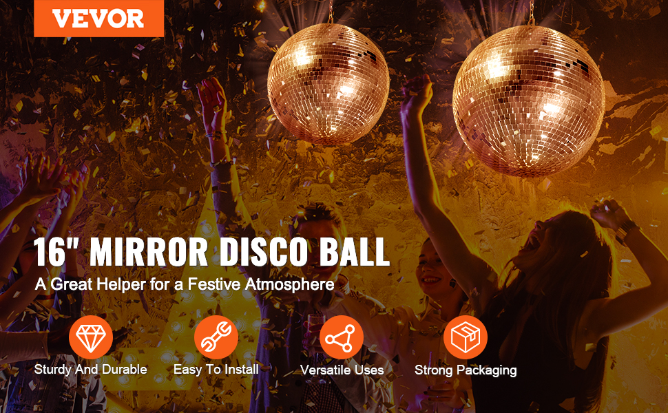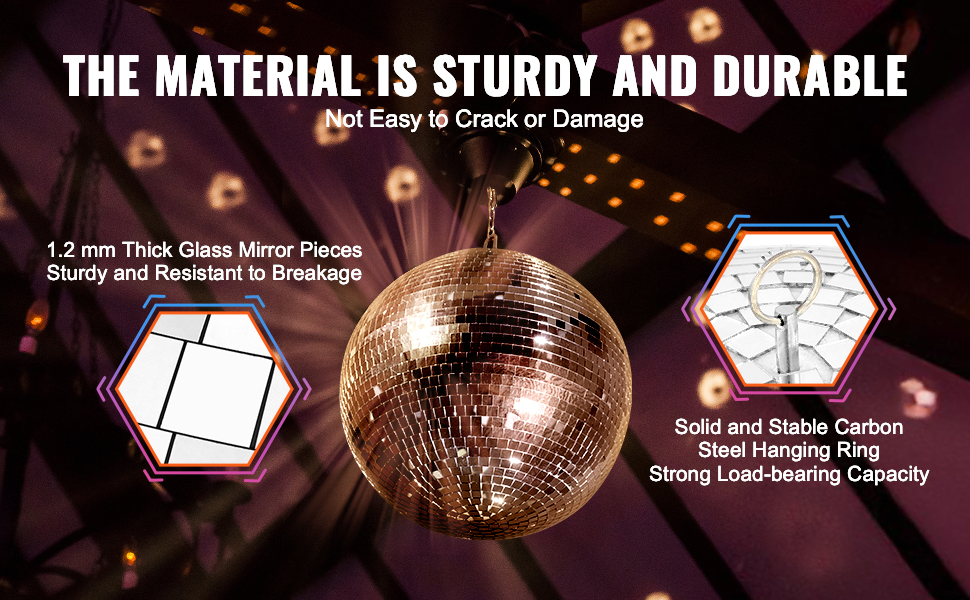 Vďaka hrubým skleneným zrkadlám a silnému uhlíkovému oceľovému závesnému krúžku je táto disco guľa odolná, trvácna a pripravená žiariť po dlhú dobu.