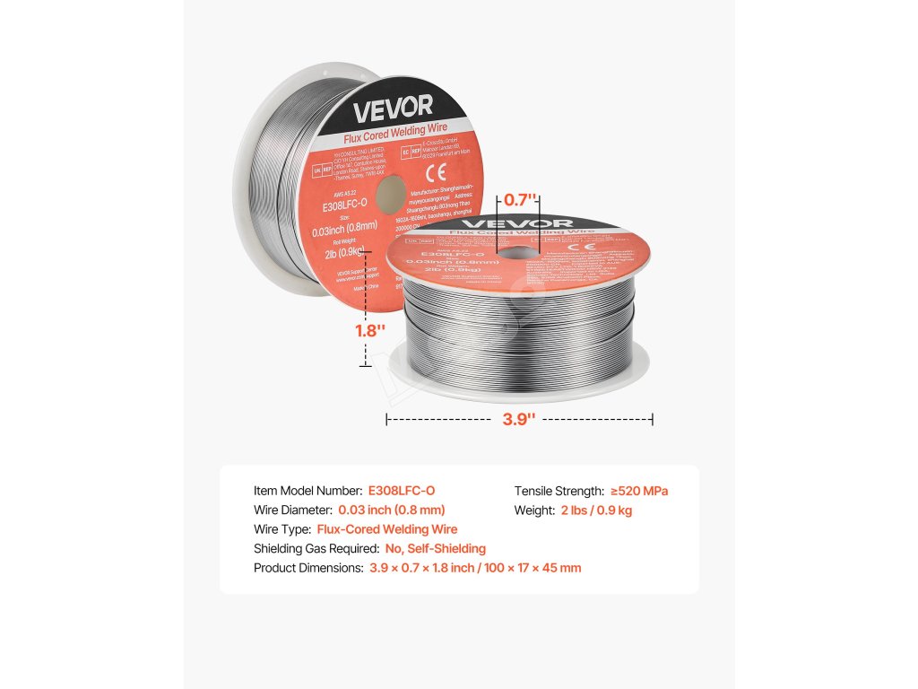 Zvárací drôt s tavidlovým jadrom VEVOR 0,03" 2 lbs E308LFC-O poskytuje pevné a konzistentné zvary s plynulým podávaním drôtu a nízkym rozstrekom. Podporuje zváranie bez plynu vo všetkých polohách a vysokú pevnosť v ťahu pre spoľahlivý výkon v automobilovom priemysle, strojárstve a pri zváracích projektoch pre domácich majstrov.
