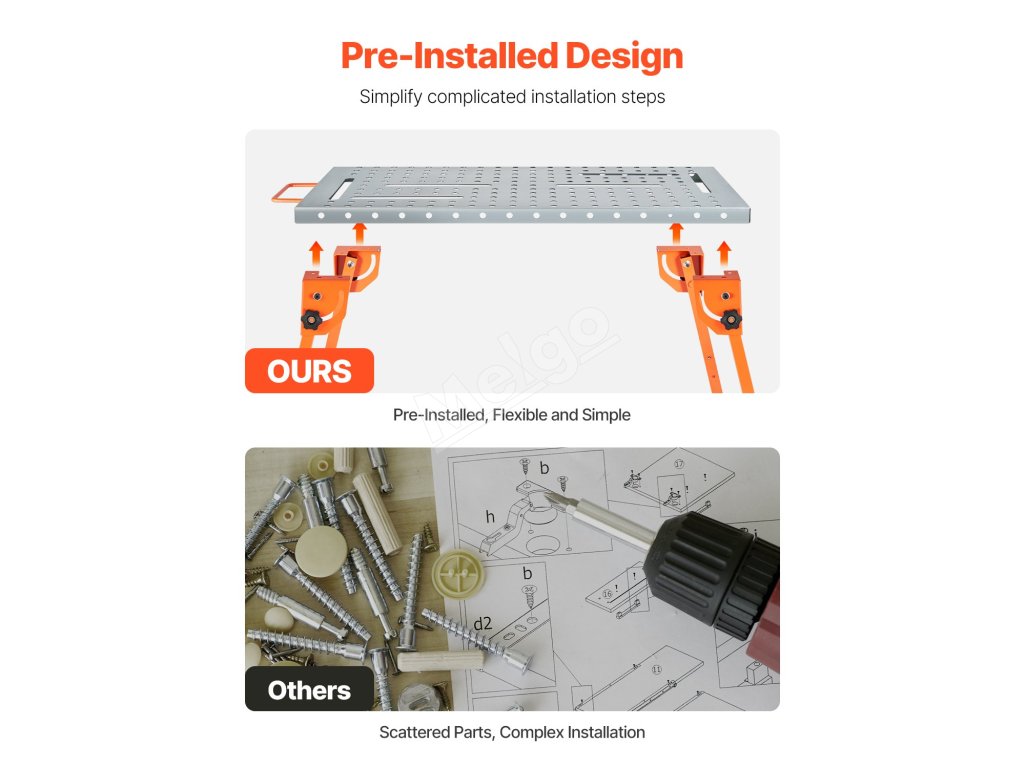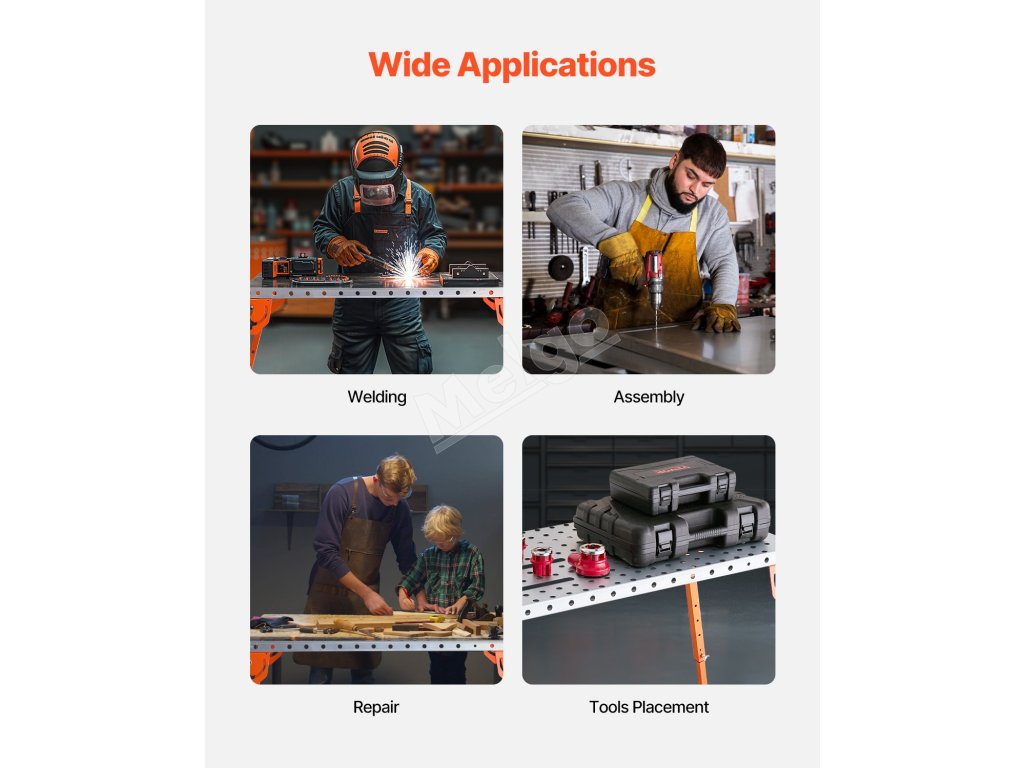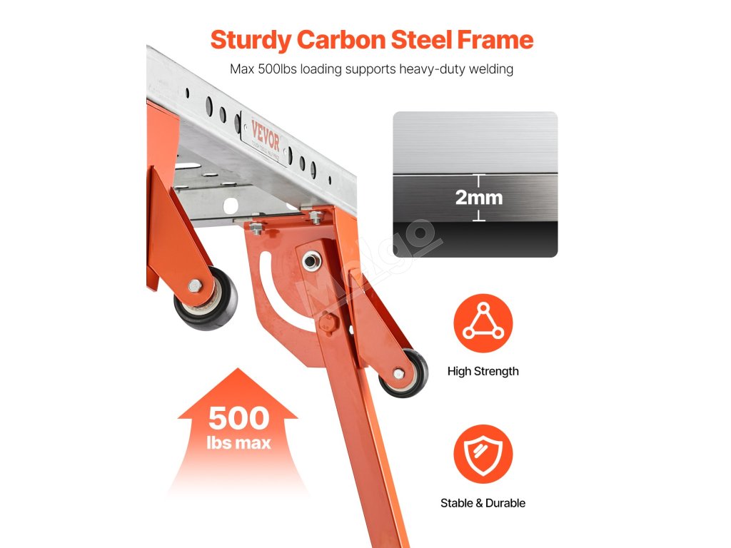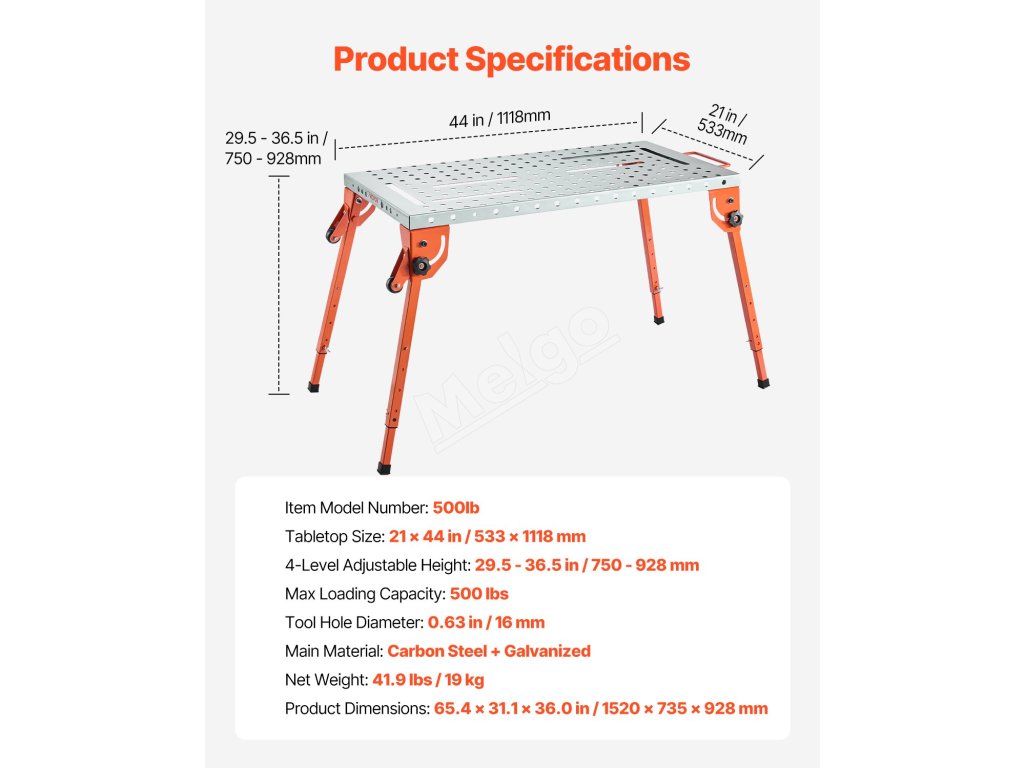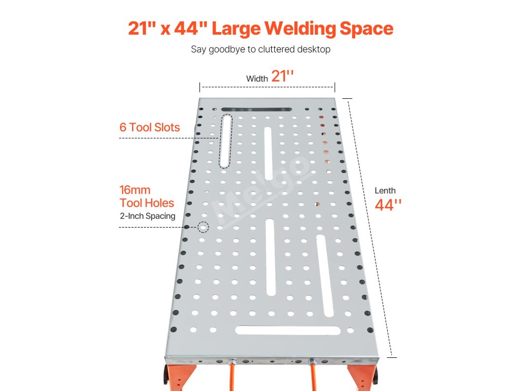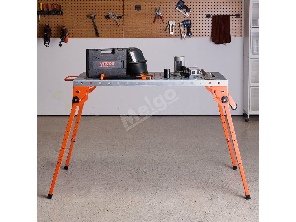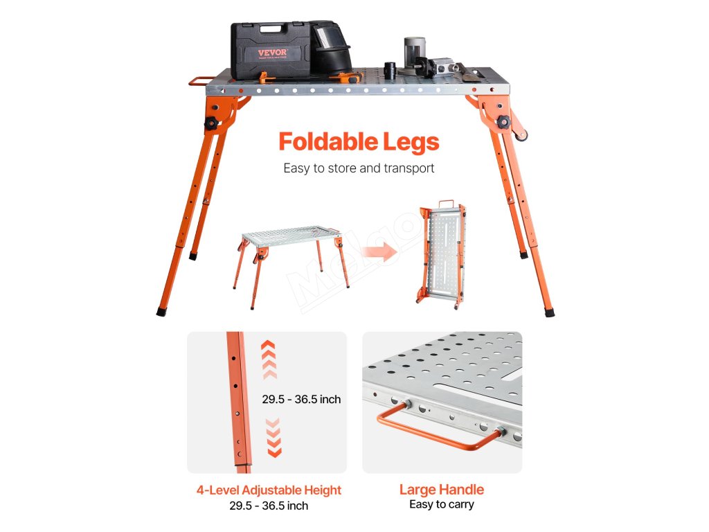 VEVOR 44 x 21-palcový skladací zvárací stôl - váš dokonalý spoločník pri zváraní. nosnosť 500 libier, 4-úrovňové nastavenie výšky, 0,63-palcové otvory na upevnenie a 6 otvorov na nástroje sľubujú všestrannosť pre vaše zváracie projekty. Rozlúčte sa s frustrujúcimi pracovnými plochami a zvýšte svoju efektivitu zvárania.