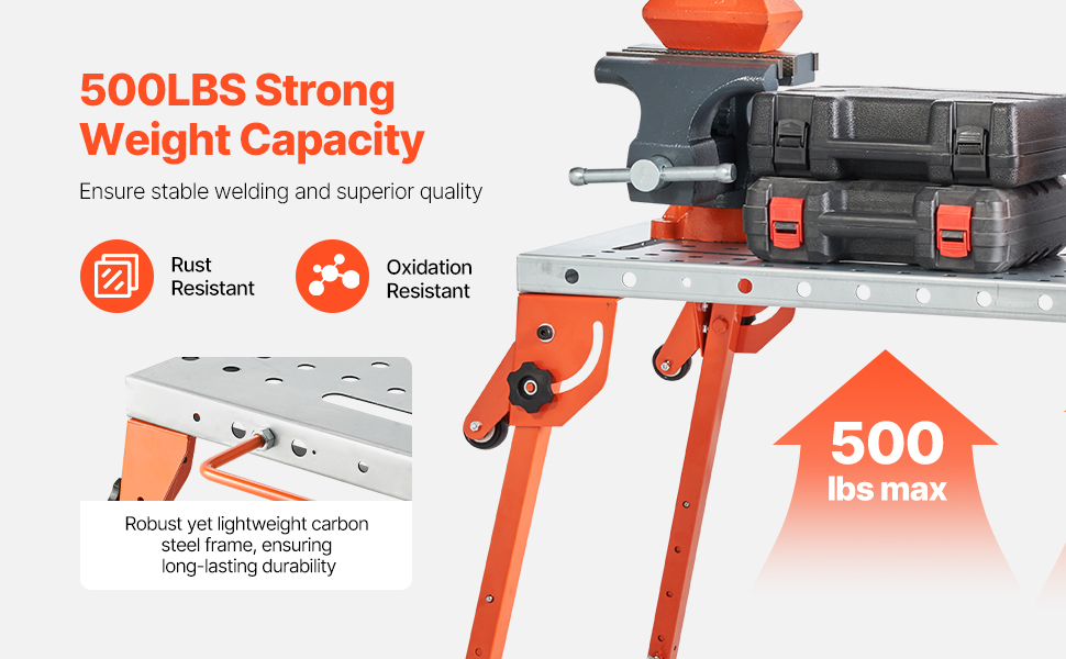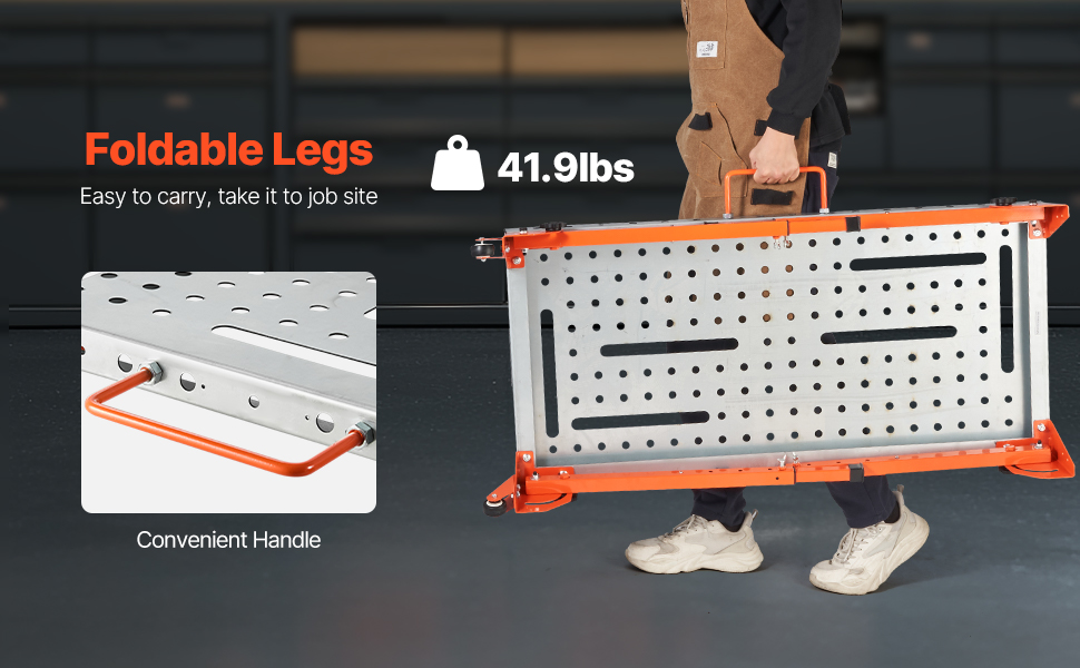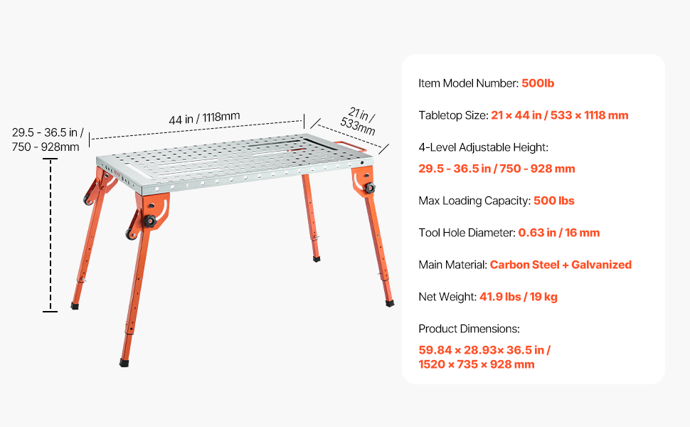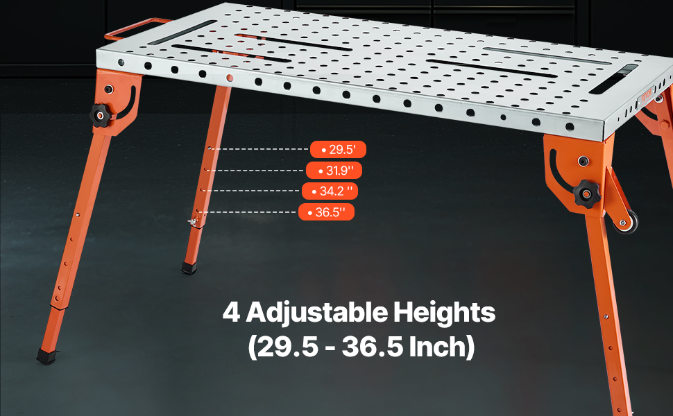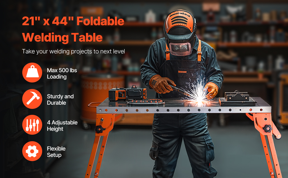 VEVOR 44 x 21-palcový skladací zvárací stôl - váš dokonalý spoločník pri zváraní. nosnosť 500 libier, 4-úrovňové nastavenie výšky, 0,63-palcové otvory na upevnenie a 6 otvorov na nástroje sľubujú všestrannosť pre vaše zváracie projekty. Rozlúčte sa s frustrujúcimi pracovnými plochami a zvýšte svoju efektivitu zvárania.