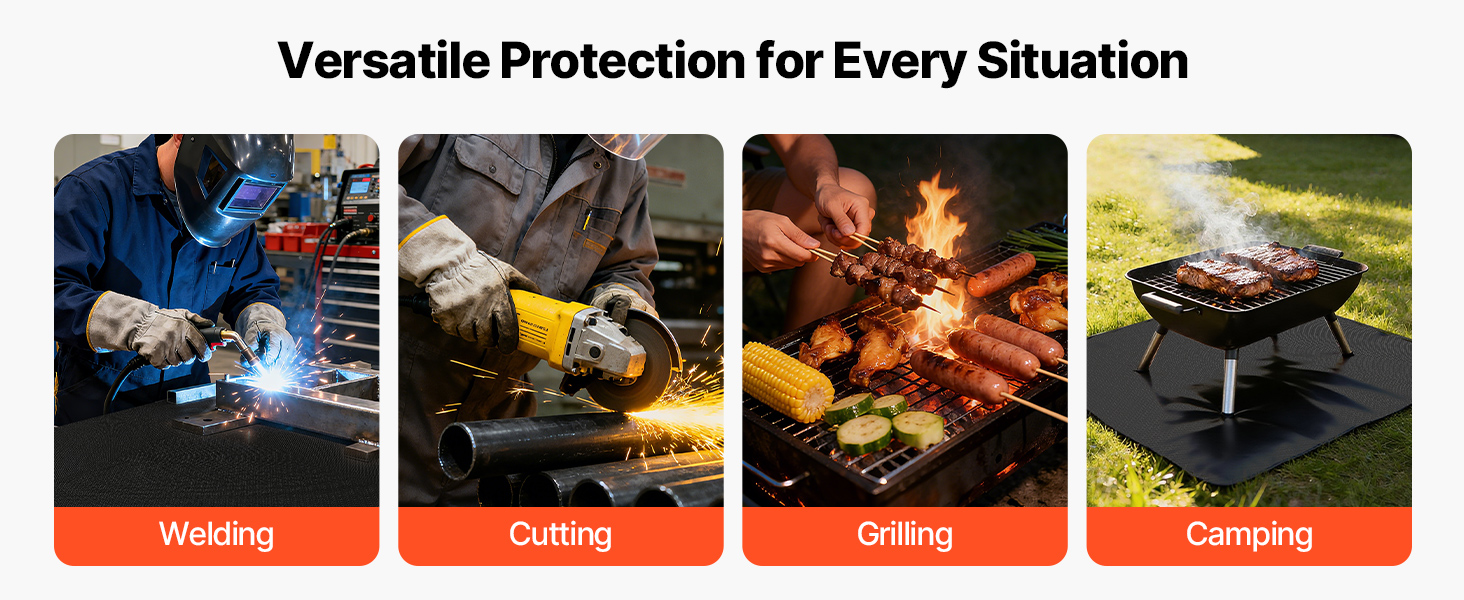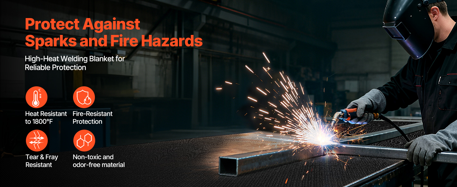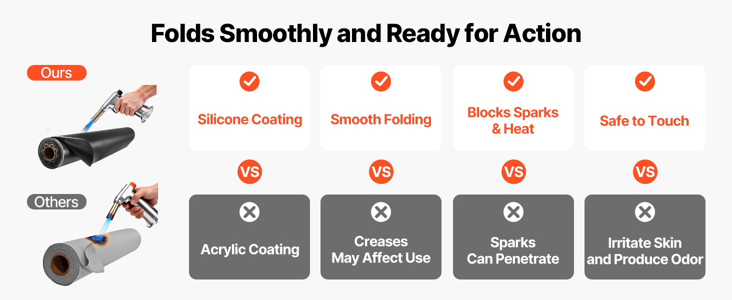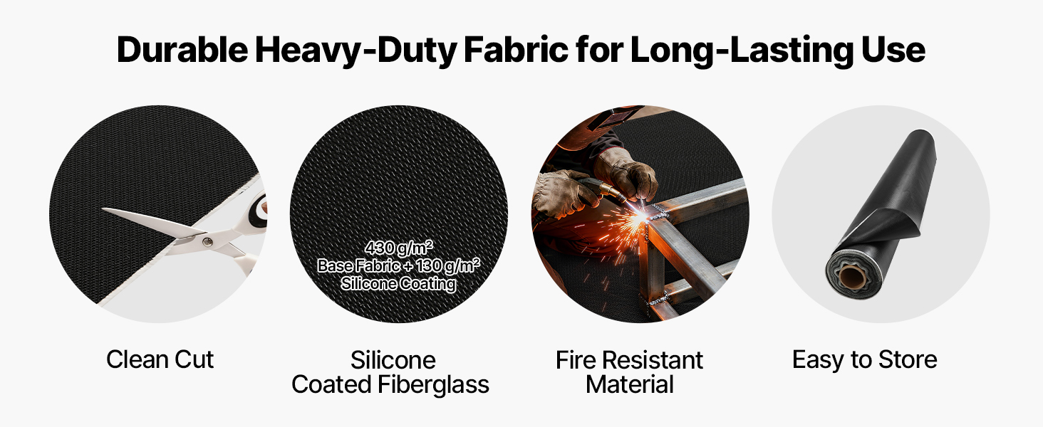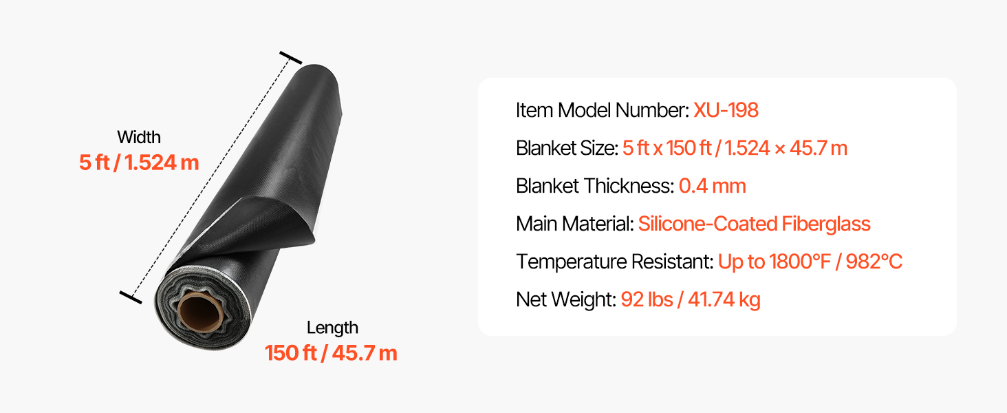 Zvitok zváracej prikrývky VEVOR 5 x 150 FT zo sklených vlákien potiahnutý silikónom odoláva teplotám až do 1800 °C a ponúka vynikajúcu odolnosť voči plameňom, čím chráni pred zváracími iskrami a roztavenými striekancami. Zostaňte v bezpečí pred rizikom požiaru a užite si bezpečnejšiu a efektívnejšiu prácu.