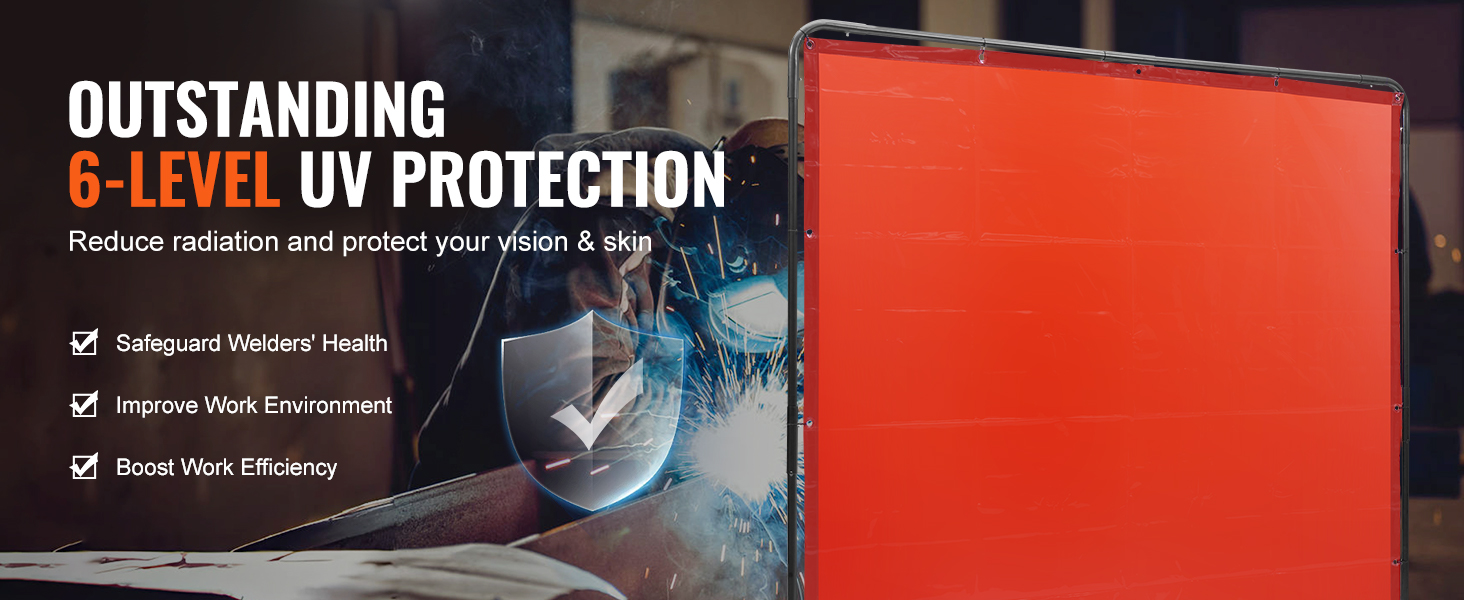 Náš zvárací záves s rámom s rozmermi 6 x 6 ft, ktorý je vylepšený 6-stupňovou špičkovou ochranou proti UV žiareniu, znižuje škodlivé UV žiarenie, chráni zrak zváračov pred nebezpečenstvom UV žiarenia a umožňuje vám pokojne pracovať bez toho, aby vás obťažovalo oslnivé svetlo.