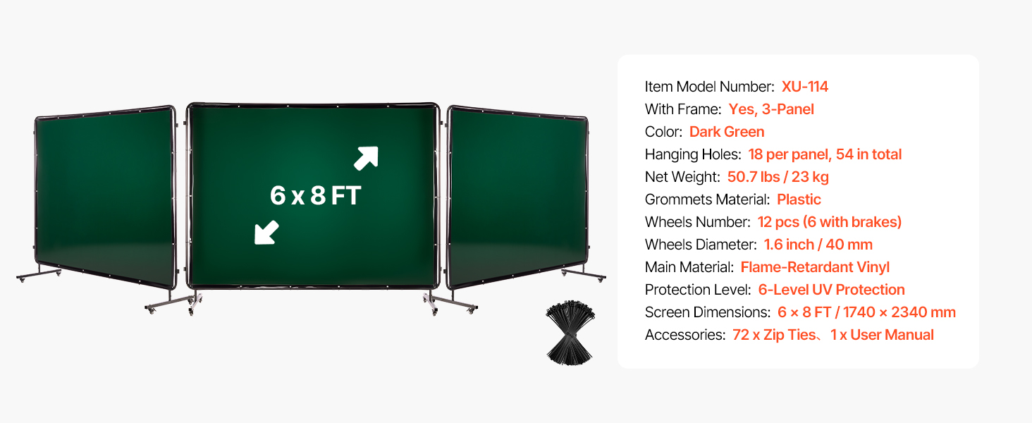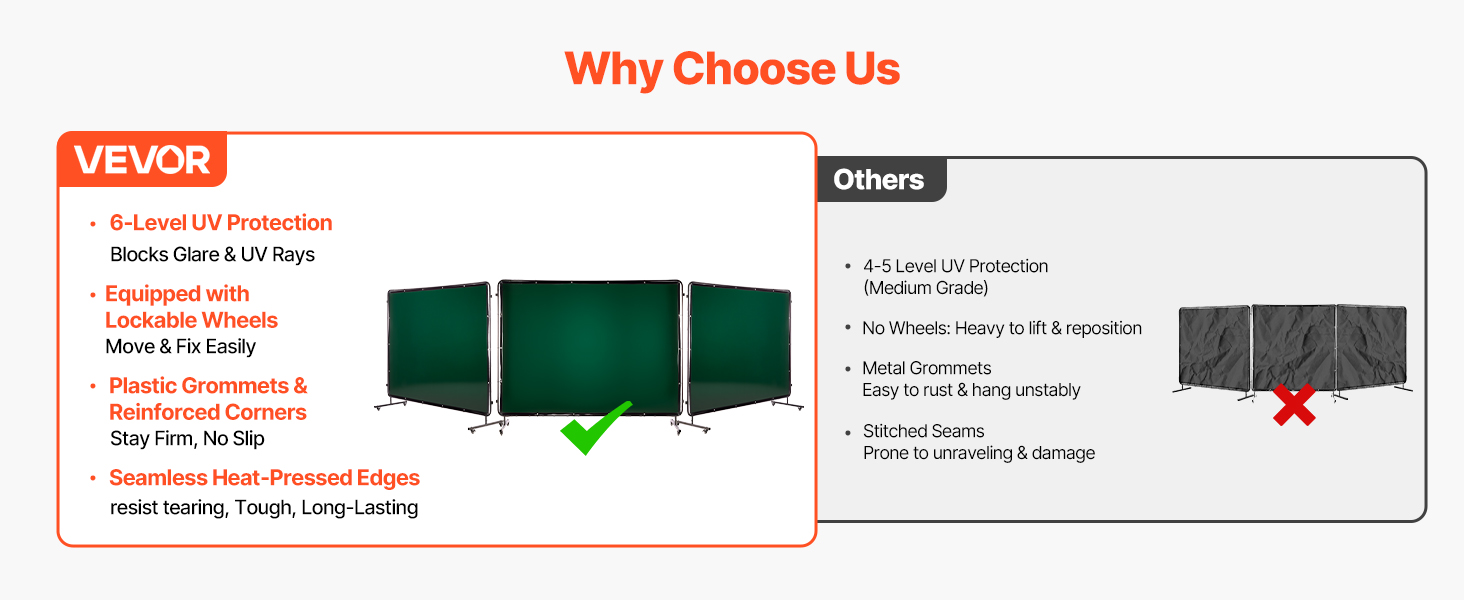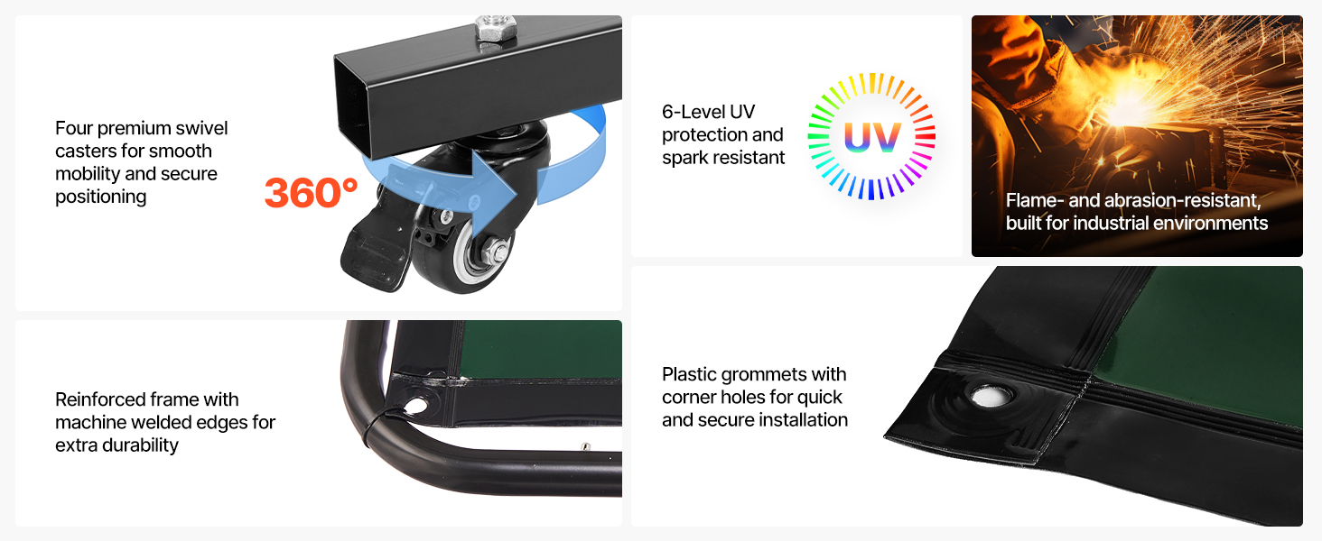 Nedovoľte, aby vašu prácu ovplyvnili vysoké teploty, iskry, roztavený kov alebo postriekanie. Zváracia zástena VEVOR s rámom je navrhnutá tak, aby poskytovala rozsiahlu a spoľahlivú ochranu vo zváračských dielňach, lodeniciach, priemyselných prevádzkach a pod.