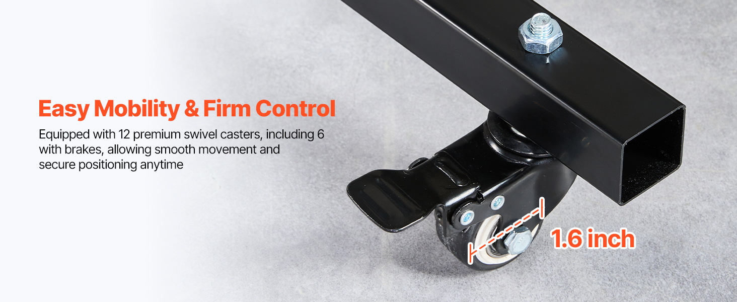 Vybavený 12 prvotriednymi otočnými kolieskami (6 s uzamykateľnými brzdami) na plynulú mobilitu a bezpečné umiestnenie na pracovisku.