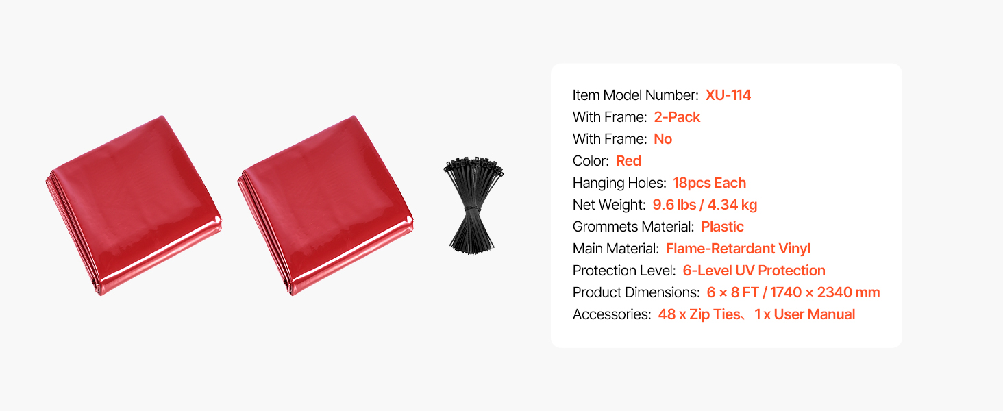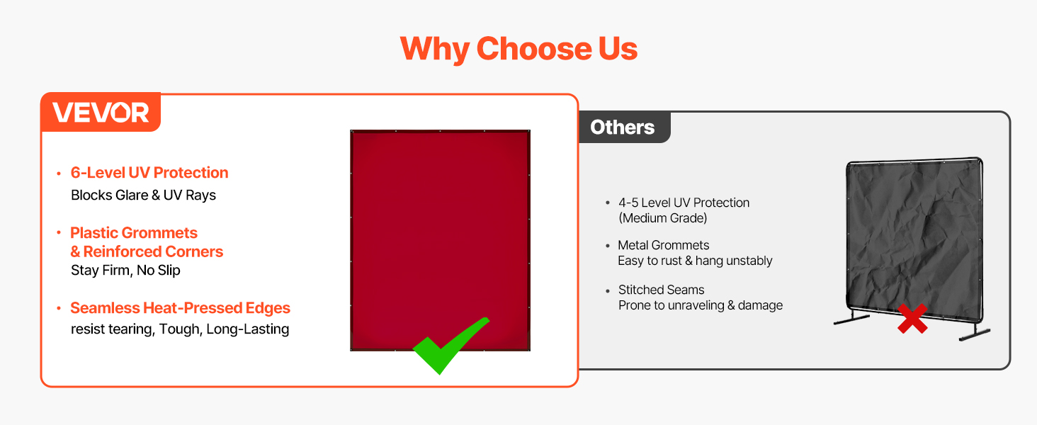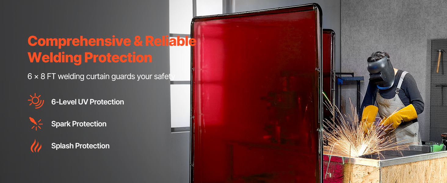 Chráňte seba a svoj pracovný priestor zváracou clonou VEVOR. Dvojdielny bezpečnostný zvárací záves VEVOR s rozmermi 6 x 8 stôp, ktorý je vybavený 6-stupňovou UV ochranou a vyrobený z nehorľavého vinylu, účinne blokuje iskry a striekanie - vytvára bezpečnejší a efektívnejší pracovný priestor.
