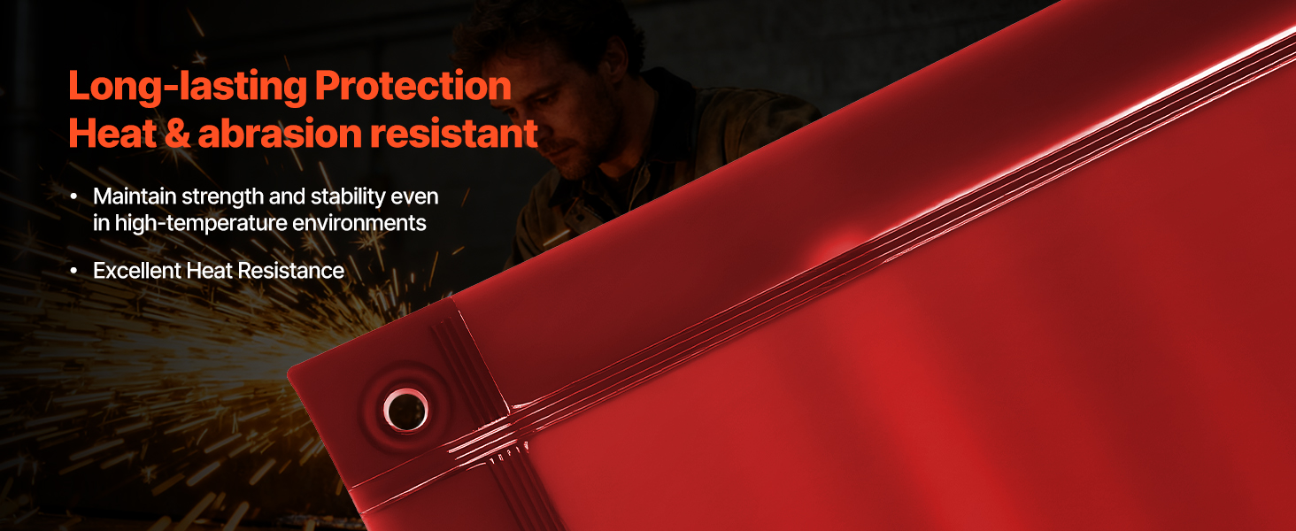 Závesný zvárací záves je vyrobený z odolného, ohňovzdorného vinylu, ktorý zabezpečuje stabilitu a dôslednú ochranu pred teplom, iskrami a oslnením počas zvárania pri vysokých teplotách.