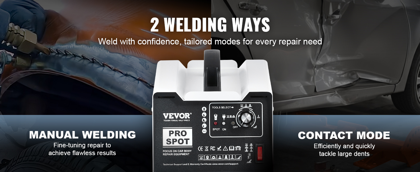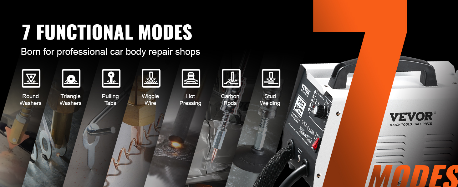 Zváračka VEVOR na automatické vyťahovanie drážok karosérie je vybavená 7 funkčnými režimami vrátane okrúhleho, OT, trojuholníkovej podložky, kmitania drôtu, lisovania za tepla, zvárania uhlíkovou tyčou a zvárania čapov. Vyhovuje rôznym potrebám opráv a poskytuje efektívne riešenia pre uhlíkovú oceľ, nehrdzavejúcu oceľ a železo.