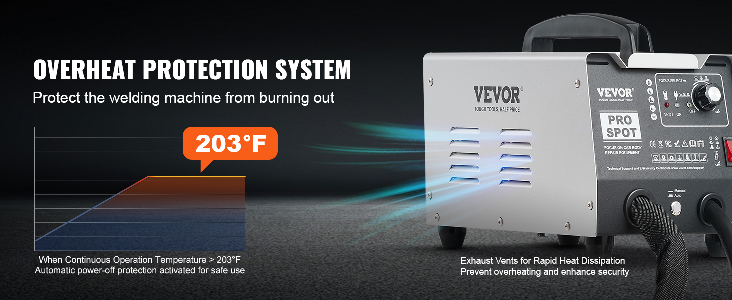 Naša bodová zváračka je vybavená inteligentným systémom ochrany proti prehriatiu, ktorý sa aktivuje, keď teplota prekročí 203℉, čím zabraňuje skratu a poškodeniu stroja. Bočné vetracie otvory tiež zabezpečujú rýchly odvod tepla, vďaka čomu je zváranie bezproblémové a bezpečné.