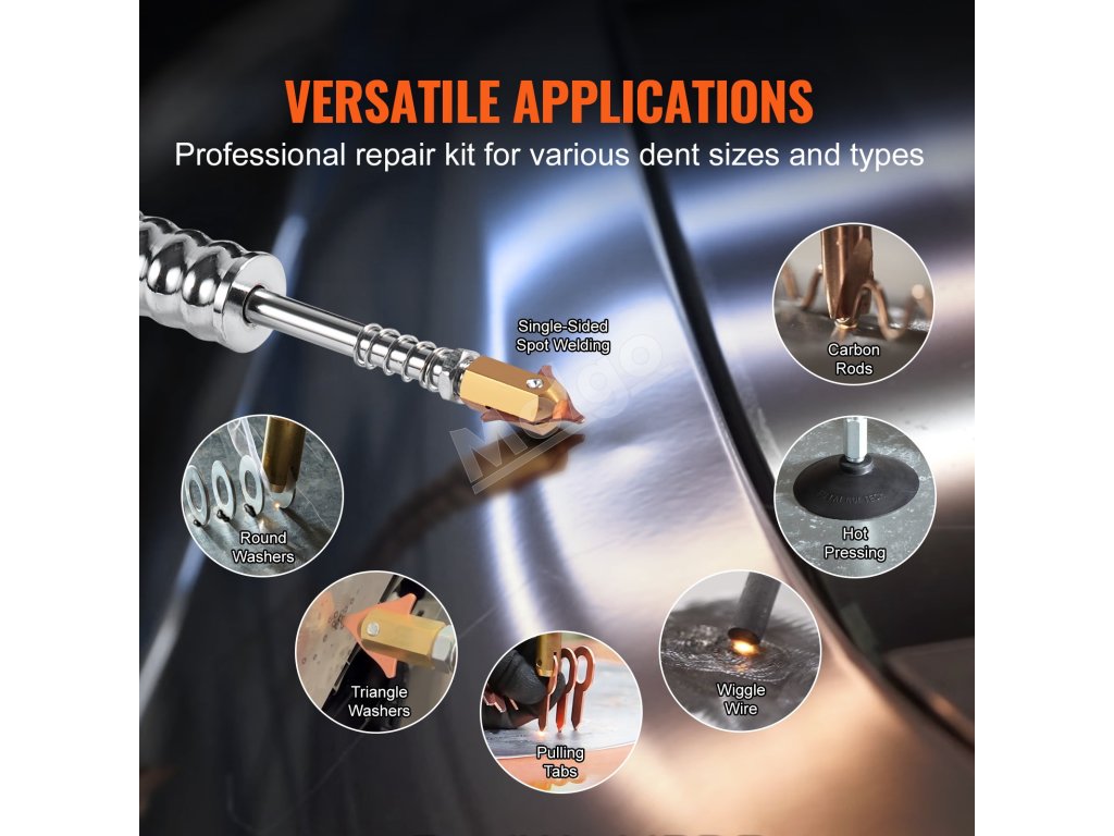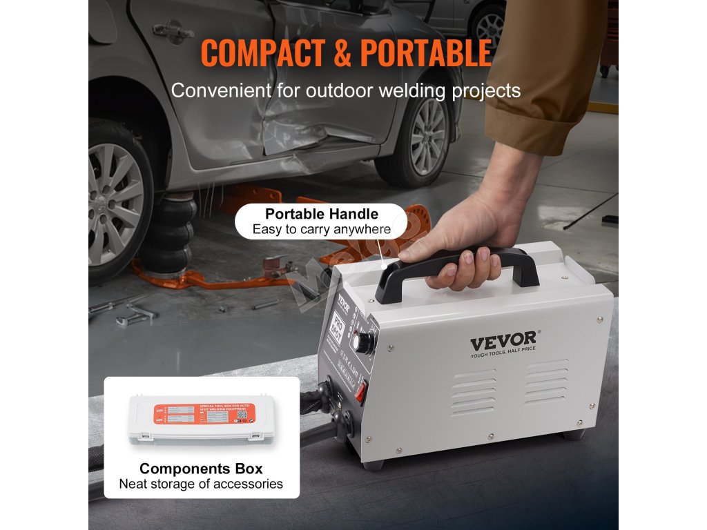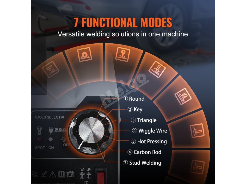 Zváračka VEVOR na automatické vyťahovanie drážok karosérie je vybavená 7 funkčnými režimami vrátane okrúhleho, OT, trojuholníkovej podložky, kmitania drôtu, lisovania za tepla, zvárania uhlíkovou tyčou a zvárania čapov. Vyhovuje rôznym potrebám opráv a poskytuje efektívne riešenia pre uhlíkovú oceľ, nehrdzavejúcu oceľ a železo.