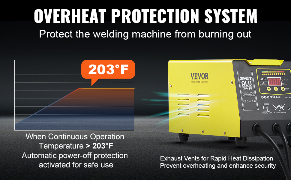 Naša bodová zváračka je vybavená inteligentným systémom ochrany proti prehriatiu, ktorý sa aktivuje, keď teplota prekročí 203℉, čím zabraňuje skratu a poškodeniu stroja. Bočné vetracie otvory tiež zabezpečujú rýchly odvod tepla, vďaka čomu je zváranie bezproblémové a bezpečné.