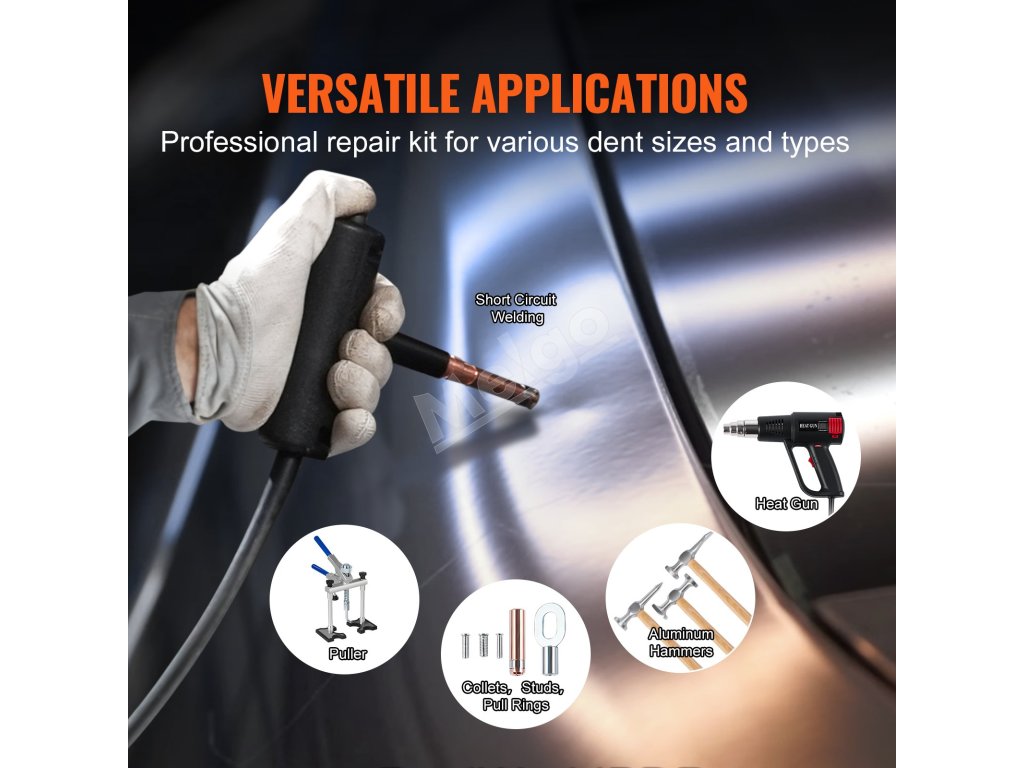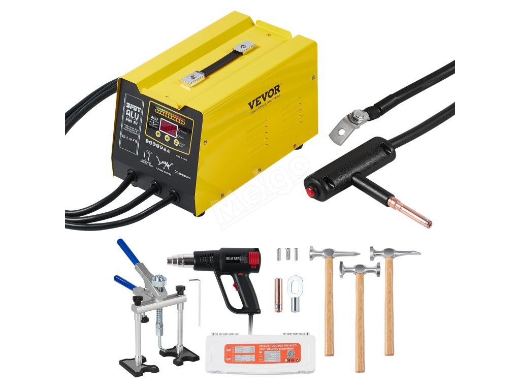 Súprava na vyťahovanie preliačin VEVOR, ktorá kombinuje mostíkový vyťahovač s teplovzdušnou pištoľou, najprv tepelne upraví preliačiny a potom využíva mostíkový vyťahovač na presné ovládanie sily vyťahovania, čo umožňuje presné opravy hliníkových panelov karosérie.