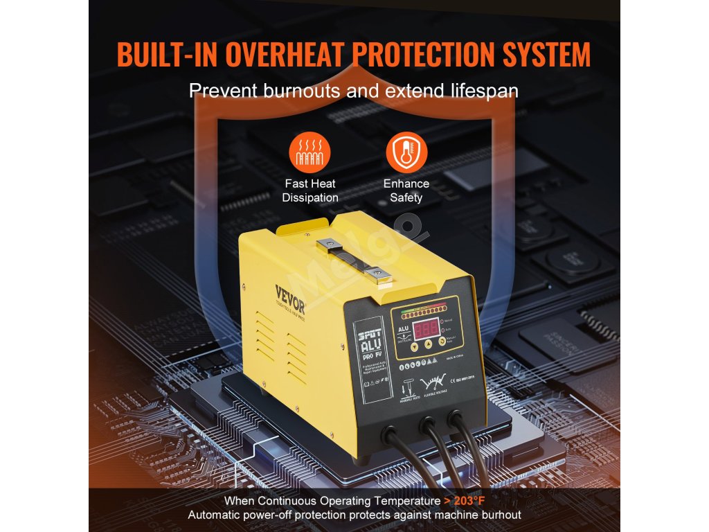 Naša bodová zváračka je vybavená inteligentným systémom ochrany proti prehriatiu, ktorý sa aktivuje, keď teplota prekročí 203℉, čím zabraňuje skratu a poškodeniu stroja. Bočné vetracie otvory tiež zabezpečujú rýchly odvod tepla, vďaka čomu je zváranie bezproblémové a bezpečné.
