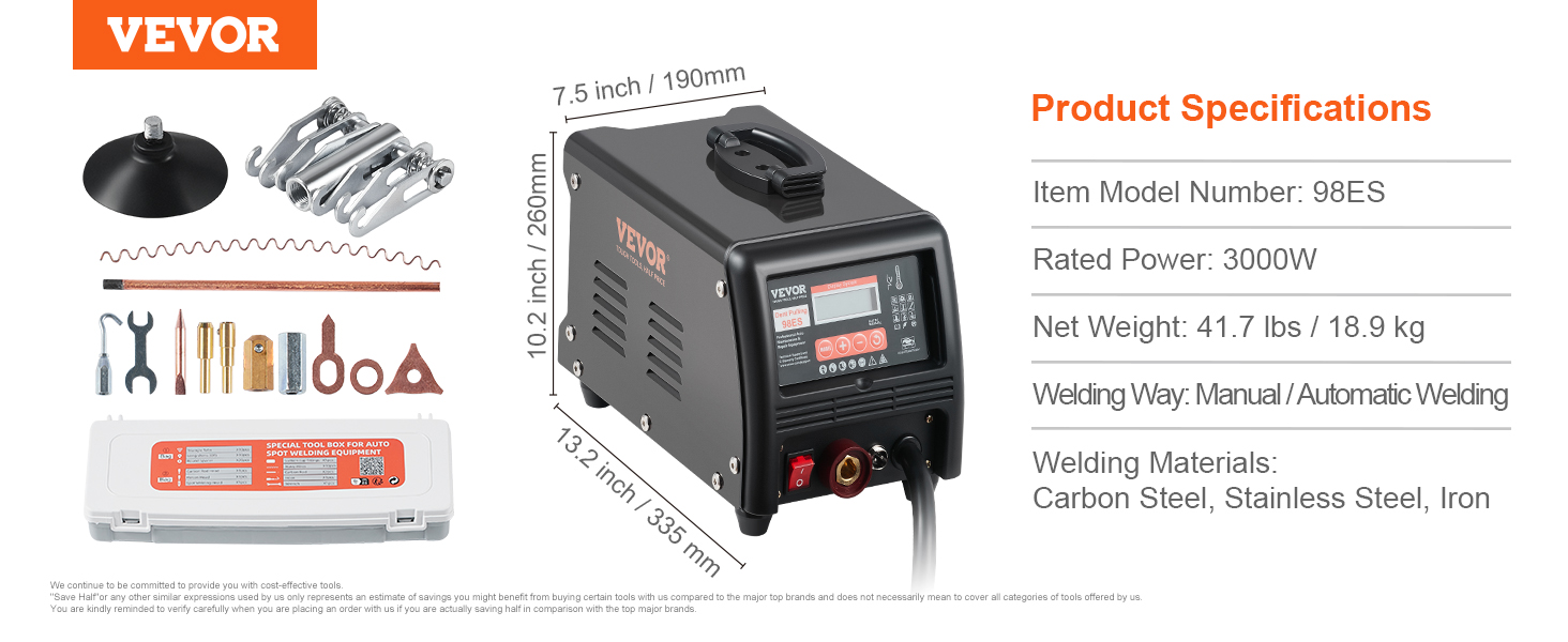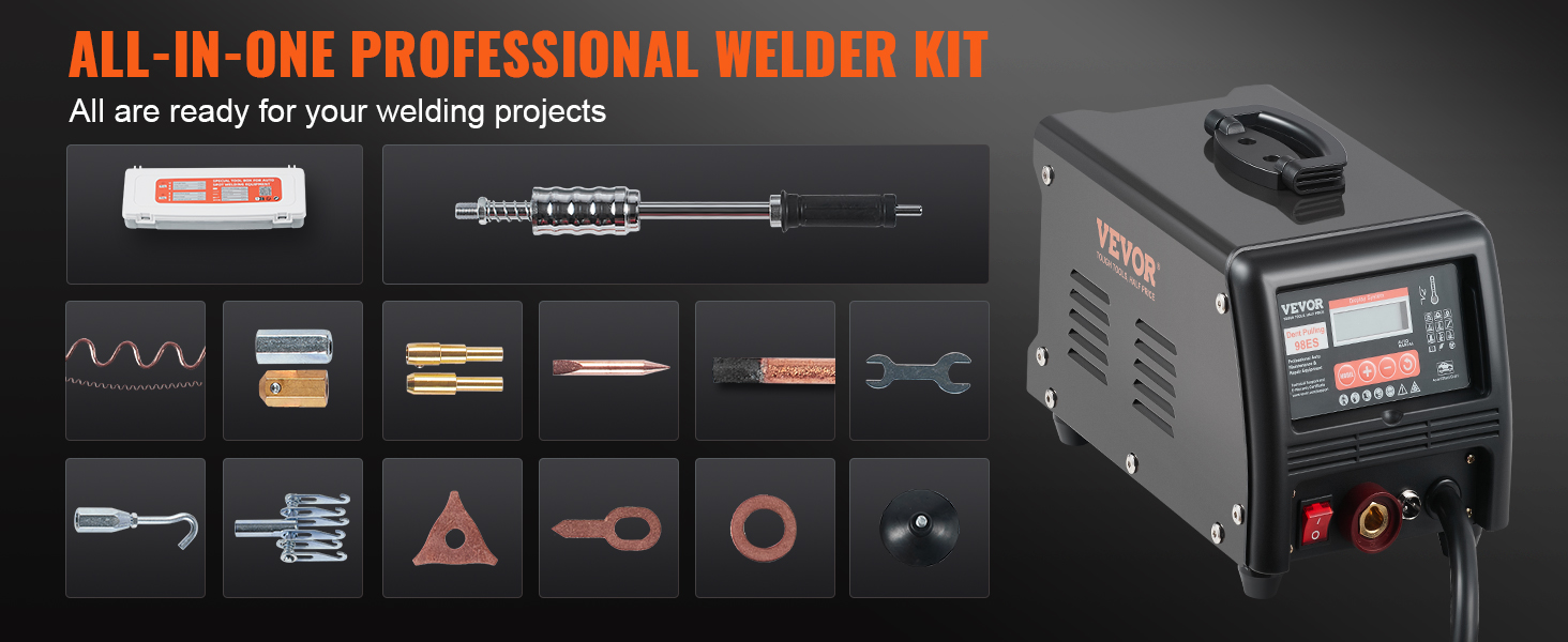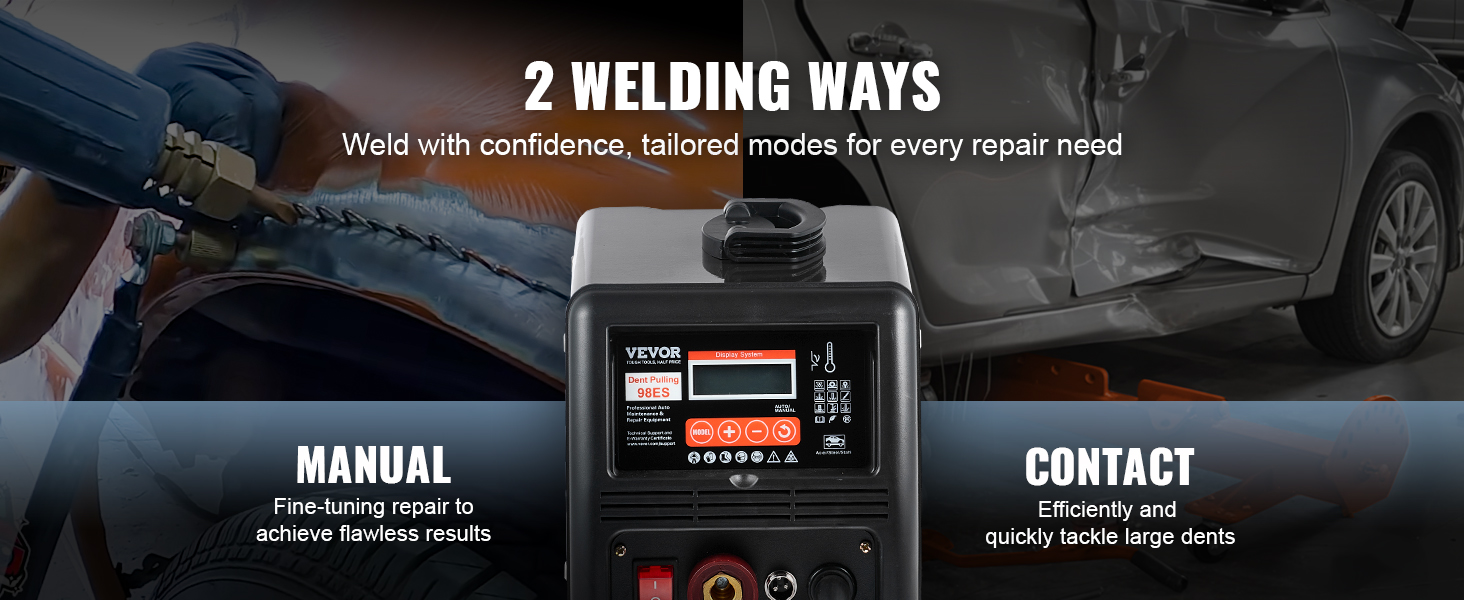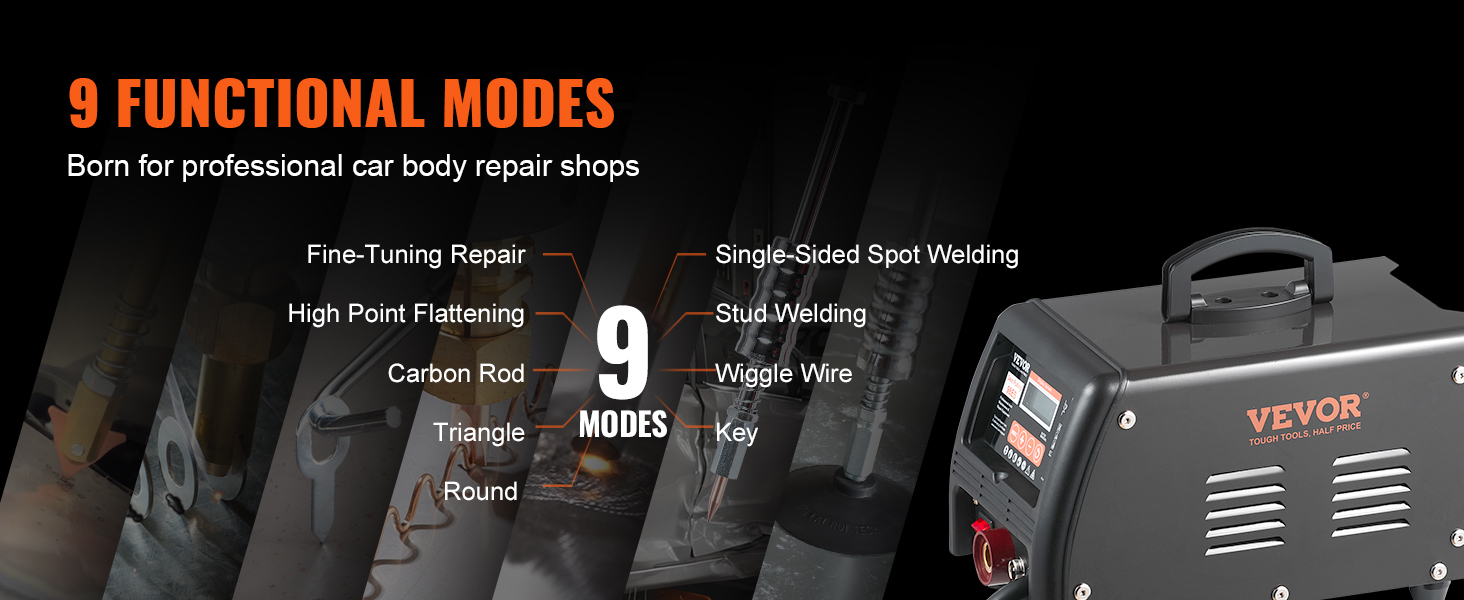 Zváračka VEVOR na vyťahovanie dutín ponúka 9 režimov vrátane jemného doladenia opravy, vyrovnávania vysokého bodu, uhlíkovej tyče, trojuholníka, kruhu, OT, kmitajúceho drôtu, jednostranného bodového zvárania a zvárania čapov. Uspokojuje rozmanité potreby opráv a poskytuje efektívne riešenia pre uhlíkovú oceľ, nehrdzavejúcu oceľ, železo.