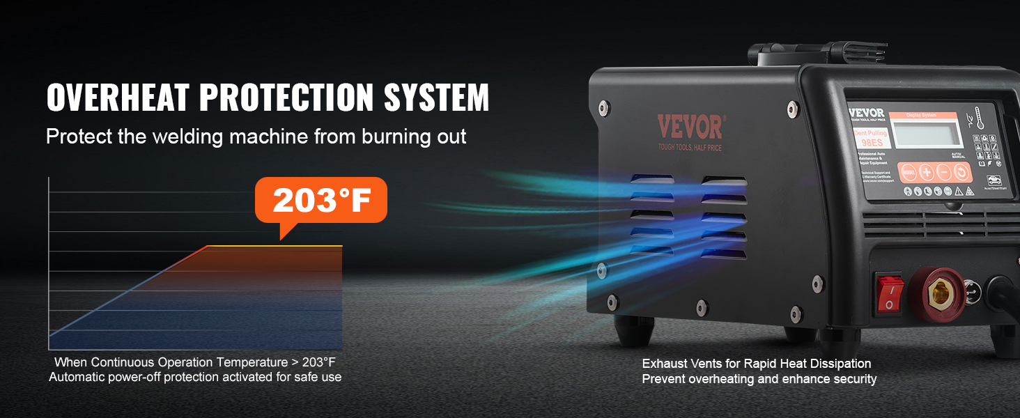 Naša bodová zváračka je vybavená inteligentným systémom ochrany proti prehriatiu, ktorý sa aktivuje, keď teplota prekročí 203℉, čím zabraňuje skratu a poškodeniu stroja. Bočné vetracie otvory tiež zabezpečujú rýchly odvod tepla, vďaka čomu je zváranie bezproblémové a bezpečné.
