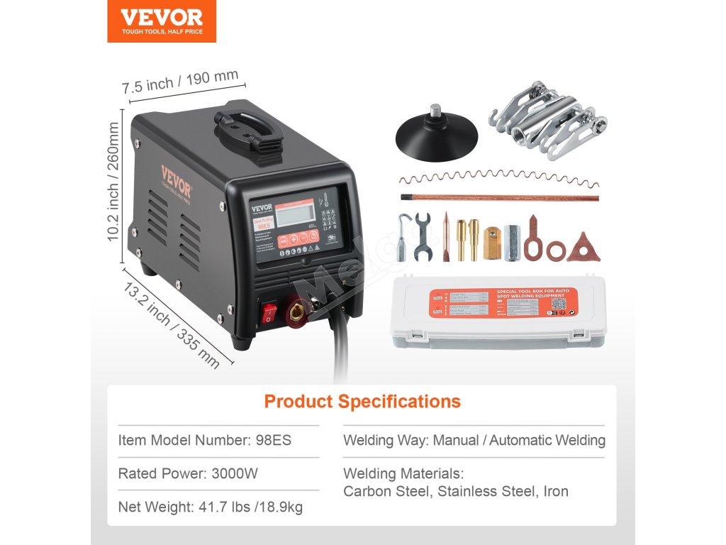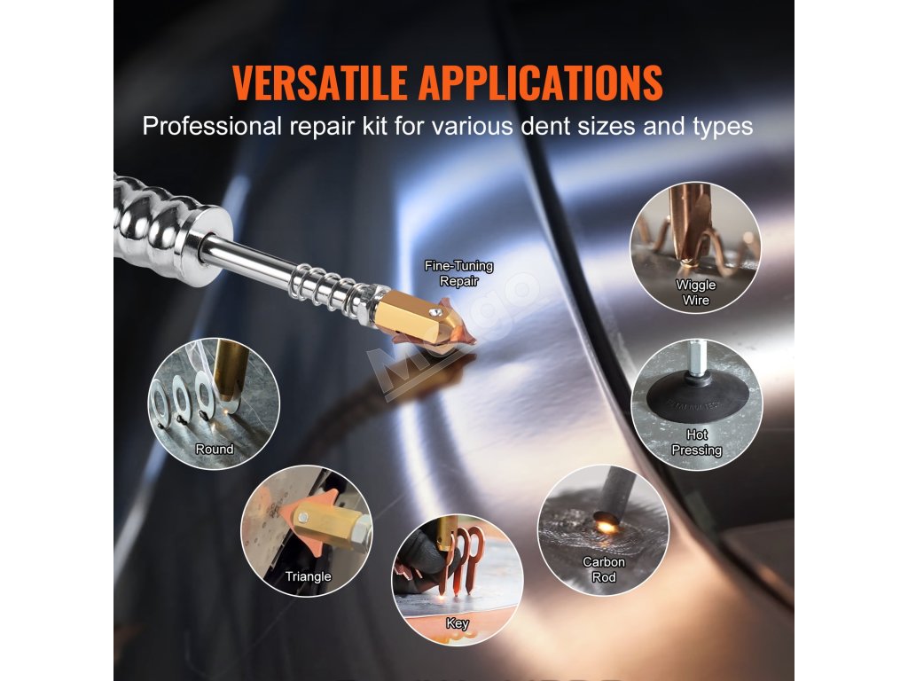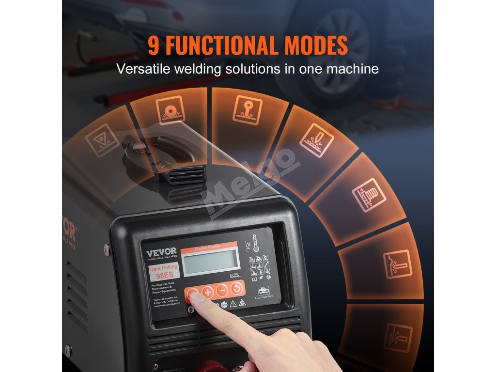 Zváračka VEVOR na vyťahovanie dutín ponúka 9 režimov vrátane jemného doladenia opravy, vyrovnávania vysokého bodu, uhlíkovej tyče, trojuholníka, kruhu, OT, kmitajúceho drôtu, jednostranného bodového zvárania a zvárania čapov. Uspokojuje rozmanité potreby opráv a poskytuje efektívne riešenia pre uhlíkovú oceľ, nehrdzavejúcu oceľ, železo.