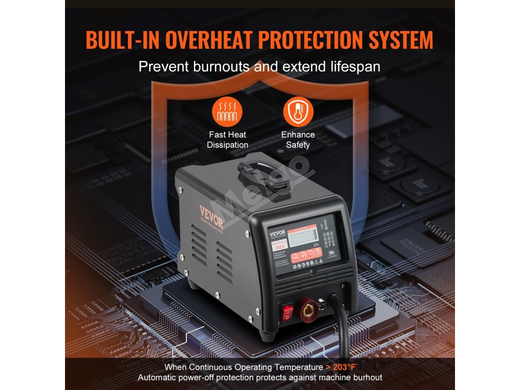 Naša bodová zváračka je vybavená inteligentným systémom ochrany proti prehriatiu, ktorý sa aktivuje, keď teplota prekročí 203℉, čím zabraňuje skratu a poškodeniu stroja. Bočné vetracie otvory tiež zabezpečujú rýchly odvod tepla, vďaka čomu je zváranie bezproblémové a bezpečné.